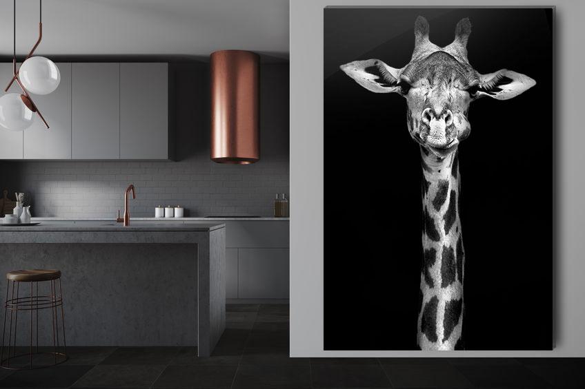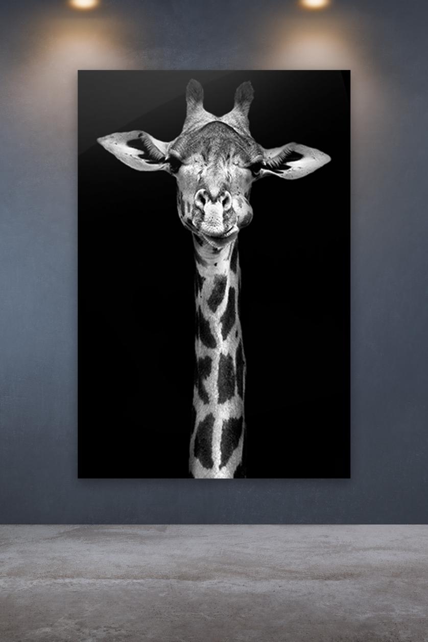 Artwork met grote hoogte: zwart wit fotografie kunst giraf toont met dit black&white kunst op plexiglas een elegant portret. Een giraf steekt met kop en schouders boven de wereld uit. Laat het bijzondere dier met deze wall art tot zijn recht komen door een groot formaat. De giraf steekt met zijn mooie humoristische hoofd mooi af tegen de zwarte achtergrond. Dit contrast en het zwart wit motief van zijn vacht vormen samen een esthetisch portret met kunstzinnige trekken. Tevens is dit artwork van wilde dieren verkrijgbaar op onder andere akoestisch vilt en als print op metaal. Bekijk naast deze zwart wit fotografie kunst giraf ook andere dieren plexiglas artworks op onze website: Animals