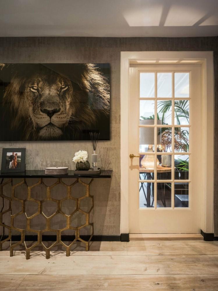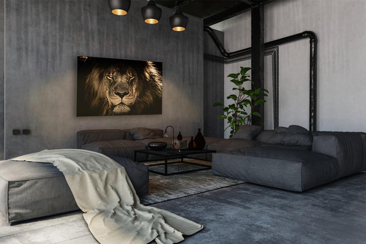 Laat de wand van je woonkamer of kantoor tot leven komen met een indrukwekkend schilderij van een leeuw. Dankzij de haarscherpe afbeelding en intense, diepe kleuren op plexiglas is de aanwezigheid van de koning der dieren voelbaar en zichtbaar. Het portret van dit roofdier met stoïcijnse, waakzame ogen, krachtige kaken, ruige manen en wilde neusharen is een eyecatcher boven het dressoir of de zitbank. Het kleurenpalet – zwart, roodbruin, bruin, geelgoud en blond – zorgt voor een stemmige sfeer. Wilt u liever een lion op een verticaal schilderij? Bekijk naast dit schilderij van wilde dieren dan eens a lion’s portrait II. Tevens verkrijgbaar op onder andere akoestisch vilt en Dibond.