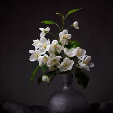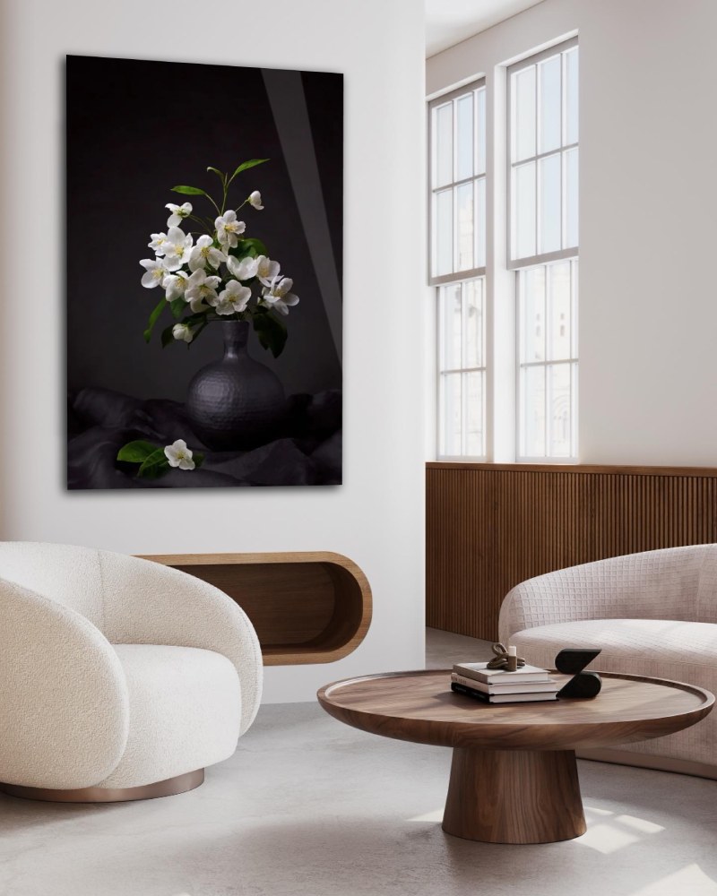 Bloemen wall art van witte appelbloesem. Stijlvolle wanddecoratie van een bloemen stilleven verkrijgbaar op acrylglas en akoestisch vilt. De witte appel bloesem in een vaas wordt getekend door een stemmige achtergrond, welke prachtig tot leven komt op ons akoestisch doek en plexiglas. Deze bloemen wall art geeft een klassiek schilderij effect een aan uw interieur zoals de oude meesters.