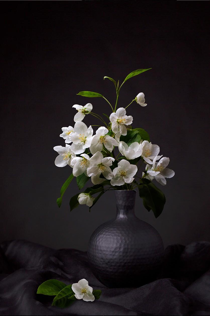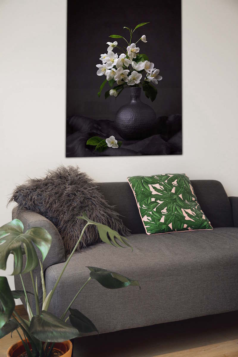 De witte bloemen geven lichte kleuren die rusten subtiel in de donkere lagen. Deze fijnzinnige ambiance komt op ons geluidsabsorberend doek, Dibond of ons plexiglas van museumkwaliteit tot in de detail tot uitdrukking. Bekijk ook andere stillevens op onze website: Still life