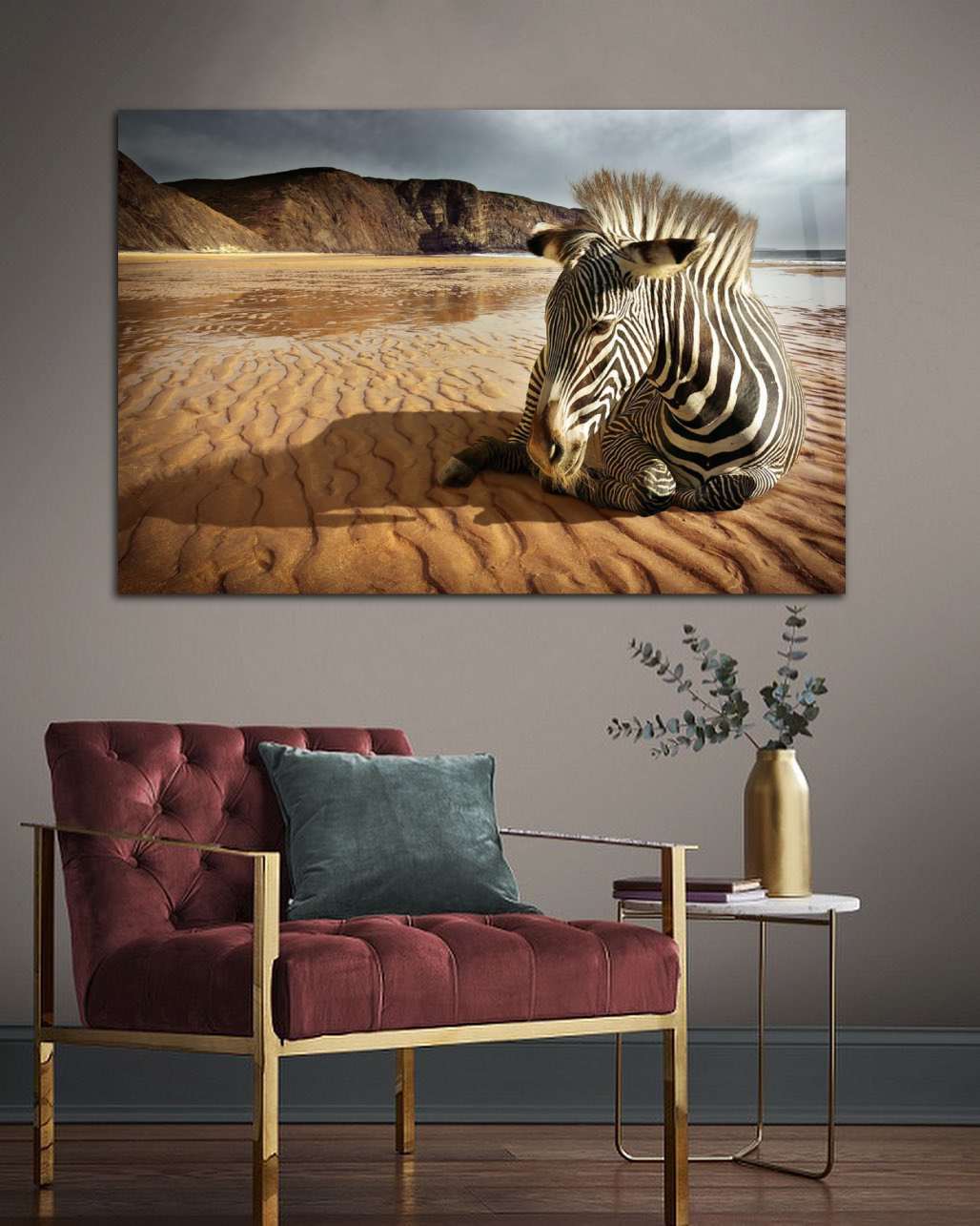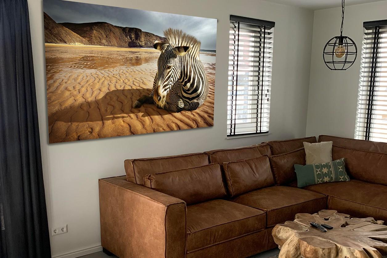 Luxe wall art van een zebra. Elke verlaten plek vertelt een verhaal. Zoals de zwarte en witte strepen uniek en onderscheidend zijn bij elke zebra, zo bijzonder is dit schilderij op plexiglas. De zebra is normaliter een kuddedier, maar vertoeft hier eenzaam en alleen op het strand. Met aan de ene kant de zee en aan de andere de hoge rotsen als afgebakend territorium. De zebra gebruikt zijn asymmetrische strepen om zich te camoufleren. Abandoned world II is fotokunst op plexiglas, waarbij het zwart-witte streeppatroon prachtig samenvalt met de kronkelende geulen en opstaande randen van het zandstrand. Net als Abandoned World is de Abandoned World is als acrylglas schilderij van wilde dieren een populair stuk uit de onze collectie plexiglas schilderijen. Tevens verkrijgbaar op onder andere akoestisch vilt en als print op metaal.