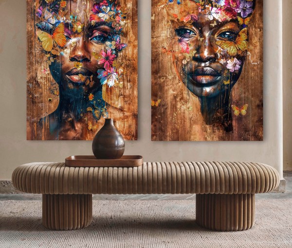 Dit portret van de mooie Afrikaanse vrouw met vlinders is onderdeel van een serie van drie en is dus geschikt als tweeluik of drieluik van dit mooie portret. Deze beautiful woman with butterflies uit Afrika is een kleurrijk wanddecor voor een stijlvol interieur en verkrijgbaar op onder andere akoestisch doek, Dibond of acrylglas. Bekijk de gehele serie van de African Butterflies: African Butterflies Collection