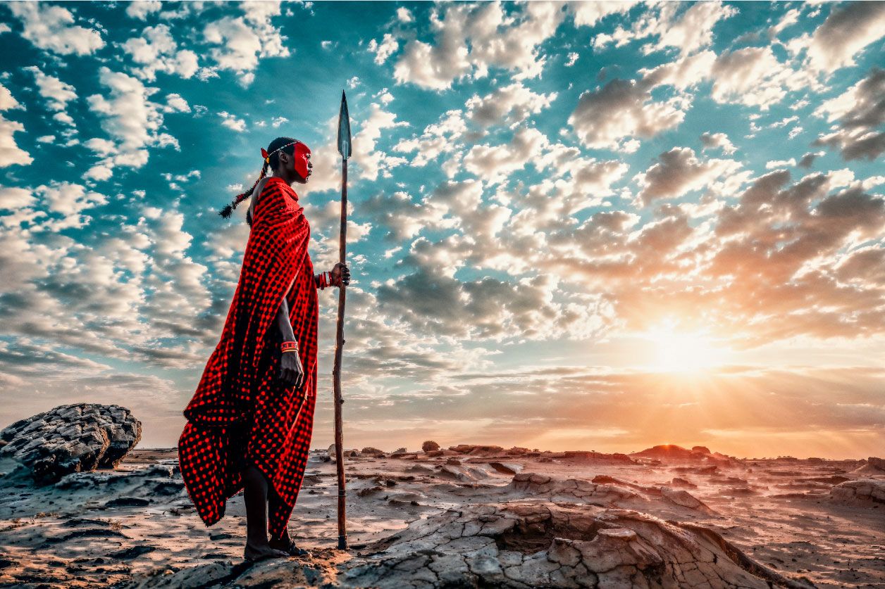 Wall art van de Afrikaanse Masai-cultuur in Afrikaans landschap. Tribal kunstfotografie van Afrikaanse stam toont een stamlid in eigen klederdracht met speer in Kenia of Tanzania (Masai-habitat) met blauwe lucht en wolken. Een bijzondere culturele artfoto voor op de muur van het nomadische volk de Masai in Afrika. Verkrijgbaar als o.a. akoestisch schilderij, Dibond wall art of plexiglas kunst van museumkwaliteit in bijna alle formaten, ook custom formaten. Neem een kijkje bij onze gehele African Tribe collectie: African Tribe Collection
