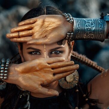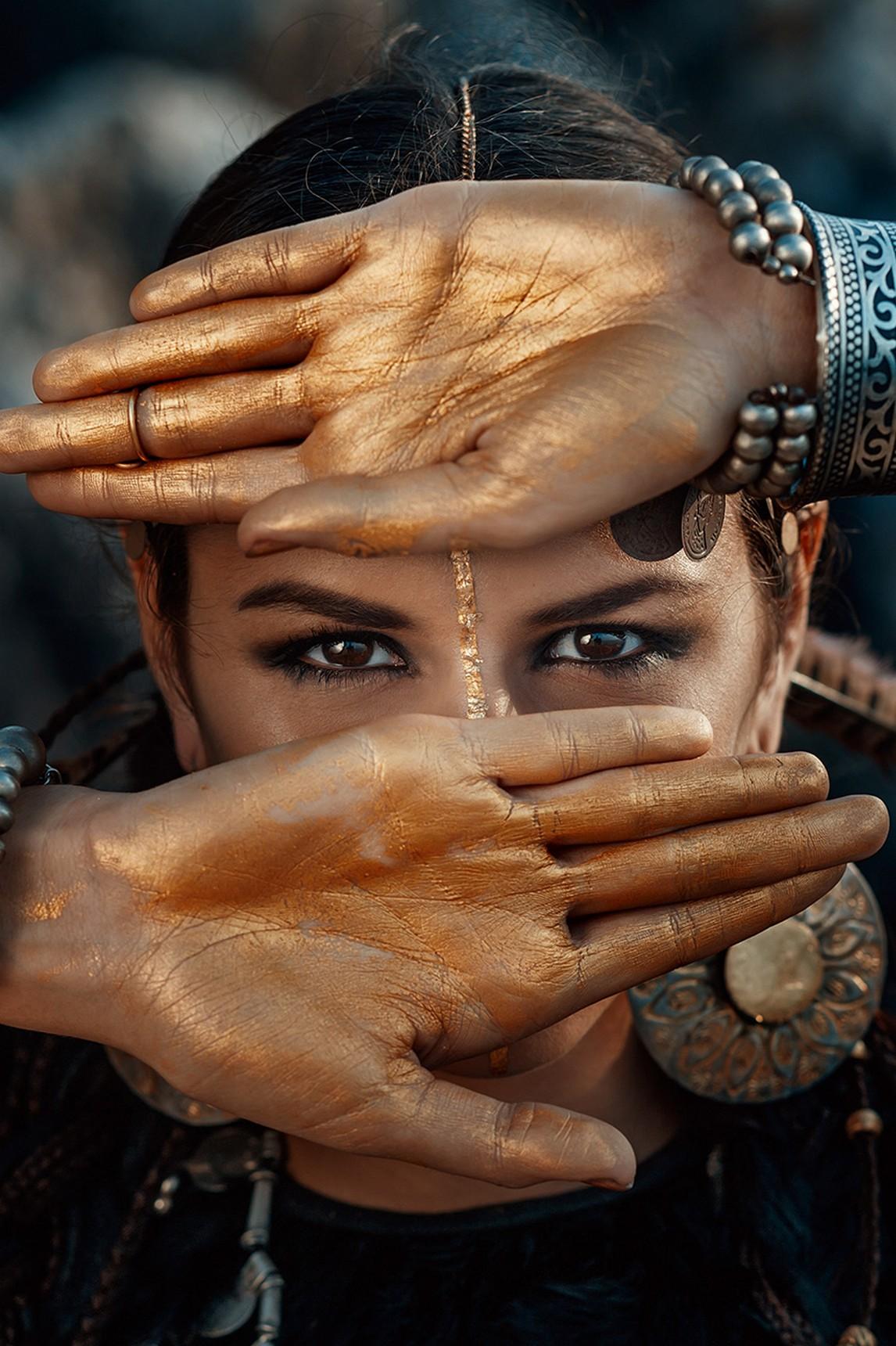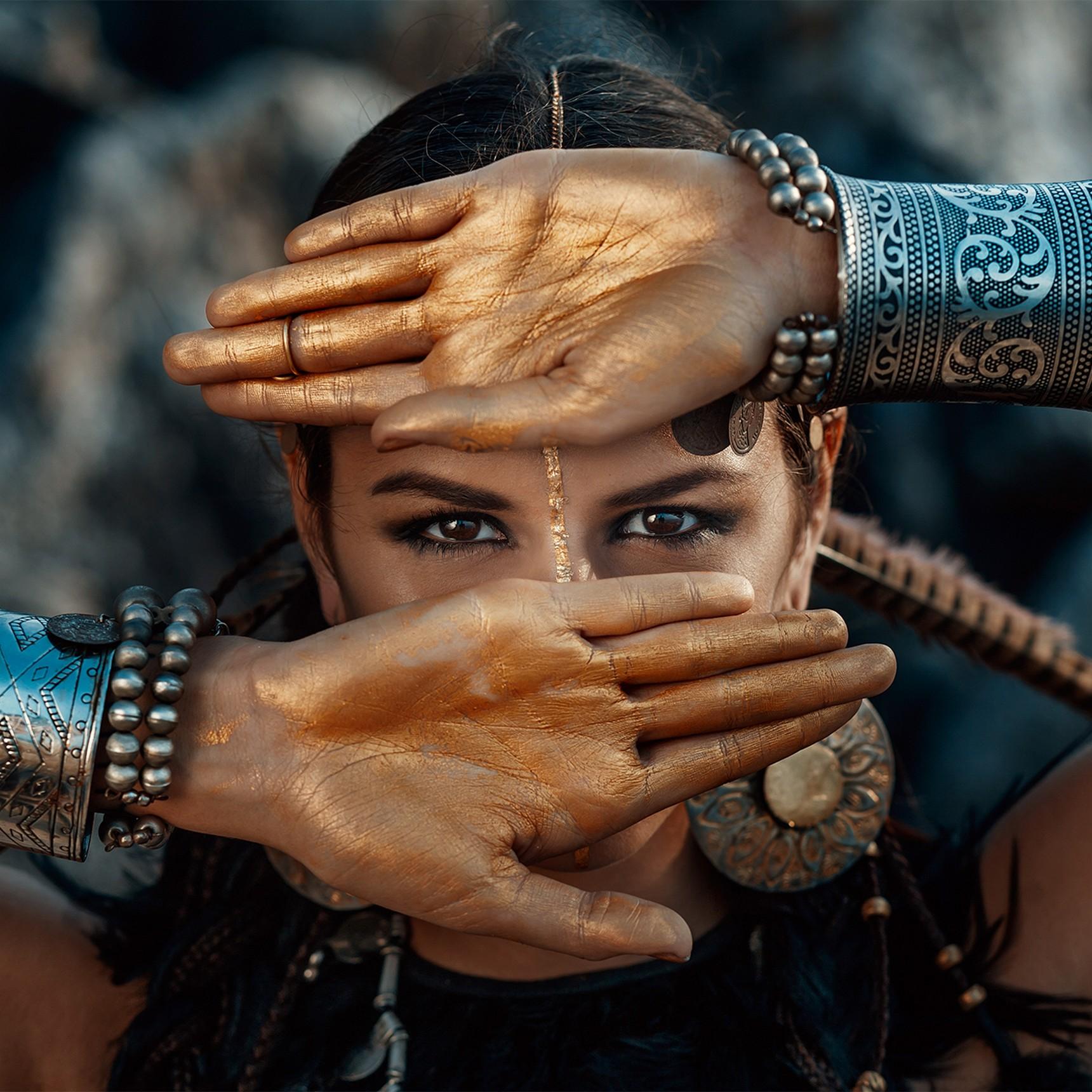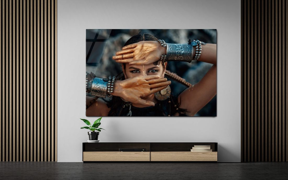 Schilderij van een mooie vrouw met symbolisch alziend oog. In vele culturen is het oog symbool van schoonheid, bescherming en wijsheid. Het oog is de spiegel van de ziel. Het plexiglas schilderij vrouw Allseeing eyes II toont een Indiaanse vrouw met grote, wijdgeopende ogen. Het alziend oog komt uit het oude Egypte, verwijzend naar de zonnegod Horus. In de aloude mythologie brengt het oog geluk. Deze foto op plexiglas kunst uit de collectie cultuur laat een tribale vrouw zien met geestelijk inzicht, hogere kennis en begaafdheid in occulte mysteriën. Haar uitdossing accentueert haar hoge status. De mooie Aziatische woman bedekt met haar handen grote delen van haar gezicht, zodat de sprekende ogen je met volle overtuiging aankijken. Liever deze mooie vrouw uit Azië in black and white? Bekijk dan de variant Allseeing eyes. Tevens verkrijgbaar op onder andere akoestisch vilt en Dibond.