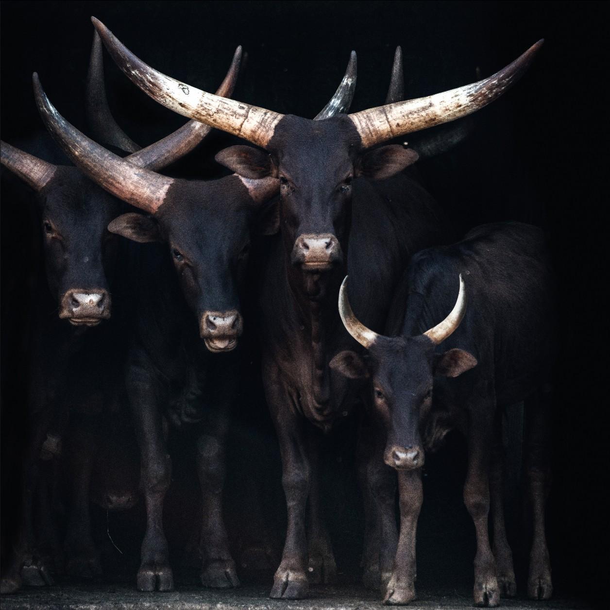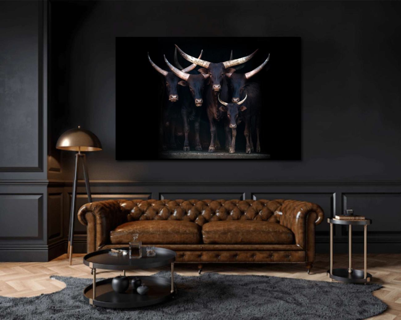 Fotokunst van koeien op akoestisch doek, Dibond en plexiglas. Met deze dieren-fotokunst haal je een schitterende compositie van een kudde Ankole Watusi-runderen in huis. Dit koeienkunstwerk is verkrijgbaar op verschillende materialen zoals akoestisch doek en acrylglas. Bekijk ook de staande variant van deze koeien wall art: Ankole Watusi