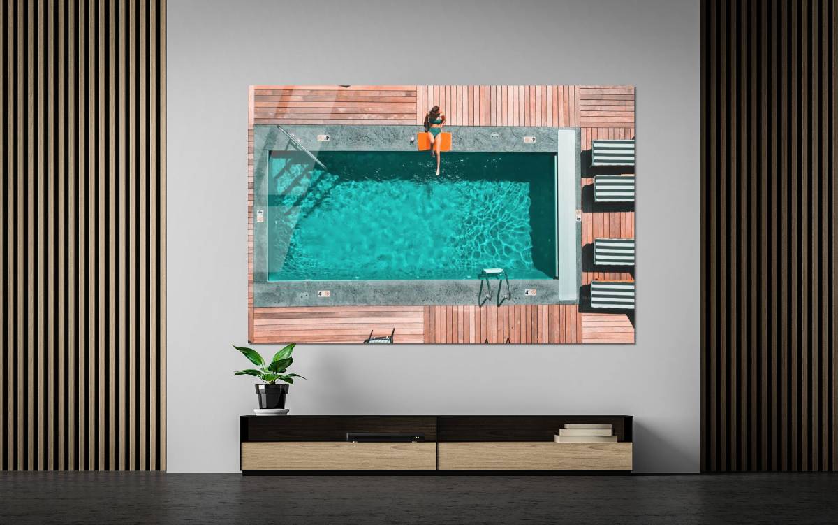 Pool art by Igor Vasiliadis. Dit plexiglas artwork toont een aangename momentopname van ontspanning bij een zwembad, vastgelegd vanuit een interessante vogelvluchtcompositie. De blauwtinten van het water en de zandkleurige warme kleuren van de houten planken roepen een zomerse stemming op, die uw interieur een chique en rustige compositie van vereeuwigde ontspanning bij het zwembad geven. Deze wall art van een zwembad verkrijgbaar op onder andere akoestisch vilt en Dibond. Bekijk ook andere pool artworks op onze website: Pool artworks