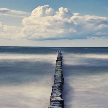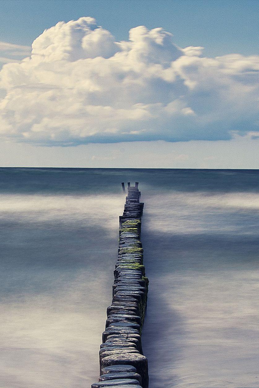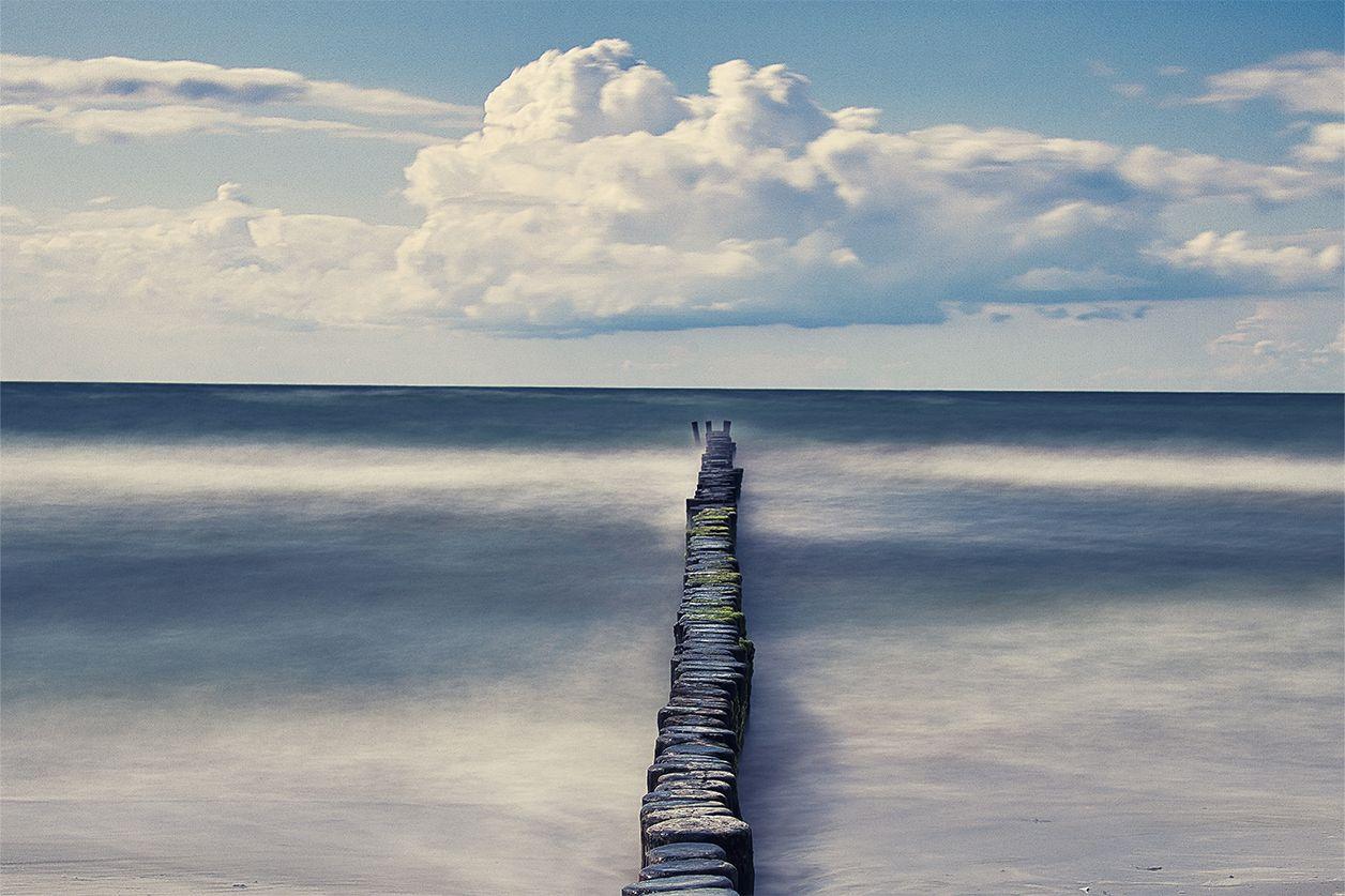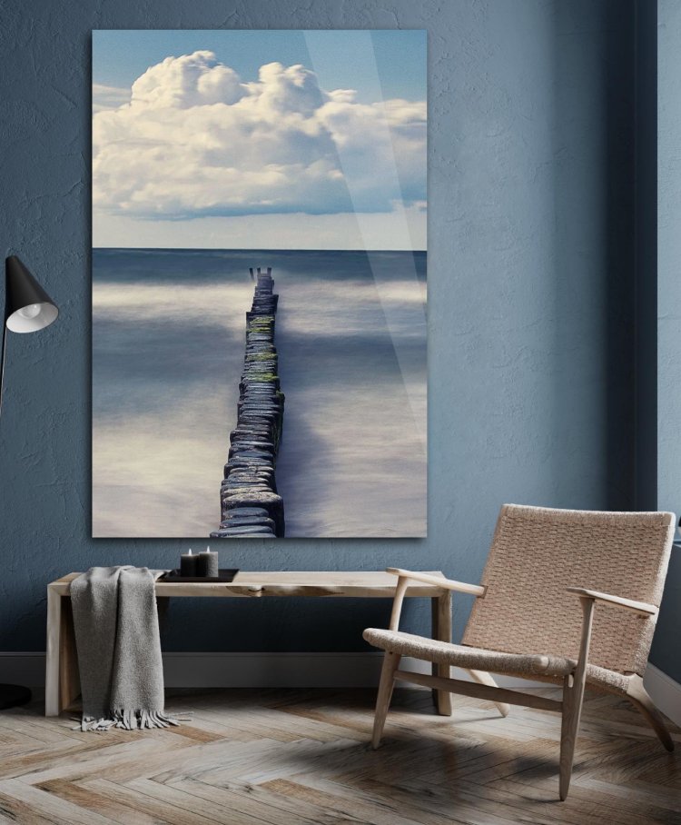 Chique schilderij van de blauwe zee met stapelwolken in een blauwe lucht. De strandpalen lopen uit in de oceaan in deze prachtige muurkunst. Verkrijgbaar op onze verschillende materialen zoals acrylglas, Dibond en akoestisch doek. Neem naast deze Baltische zee muurkunst ook een kijkje bij onze gehele landschap collectie: Landscape Collection