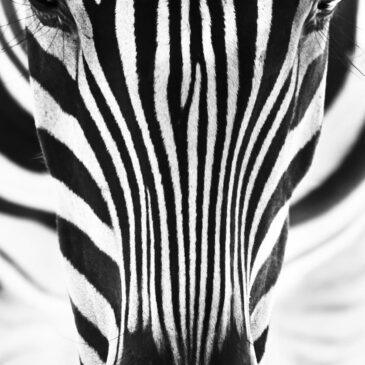 Zwart wit kunstfotografie zebra met betoverende ogen