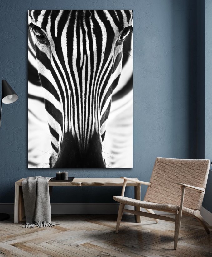 Dit hoogwaardige plexiglas artwork toont de prachtige zwart-wit kunstfotografie van een zebra met zijn betoverende ogen. De ogen zijn scherp en doordringend. Deze expressie wordt versterkt door het zwart-wit effect, de strepen van de zebra, en het contrast met de onscherpe benen op de achtergrond. De fotograaf heeft dit verder versterkt door het wit van de achtergrond af te stemmen op het wit van de zebra, waardoor deze wall art een semi-abstract effect krijgt. Dit fotokunstwerk van wilde dieren vormt een chique en speciaal wanddecor met de elegantie van het dier en de aanwezige blik in deze zwart-wit kunstfotografie van de zebra. Tevens verkrijgbaar op onder andere akoestisch vilt en Dibond. Bekijk andere dieren artworks op onze website: Animals