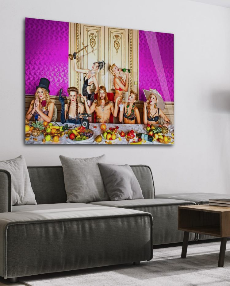 Kleurrijke, sexy wanddecoratie. Fotografie van Jordi Gomez, geïnspireerd door rijkdom, hedonisme en larger-than-life persoonlijkheden. Deze foto-art bevat glamour en erotiek, en speelt met thema’s zoals het christendom en het Laatste Avondmaal. De kunst toont een combinatie van mooie vrouwen en een sexy man. Verkrijgbaar op akoestisch vilt, als acrylglas schilderij en op Dibond. Bekijk naast deze kleurrijke, sexy wall art van de last supper ook andere unieke werken van deze fotograaf: