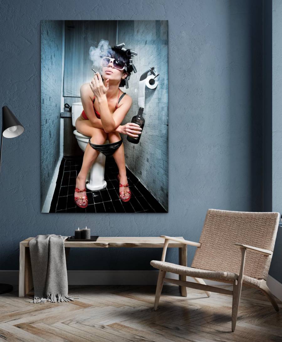 Wall decor van sexy vrouw. Dit edgy schilderij toont een echte rock & roll woman! De wall art foto laat een badass sexy vrouw zien die een sigaret rookt en drinkt op de wc. Uitdagend wandpaneel op plexiglas, Dibond of akoestisch vilt van een stoere vrouw! Neem een kijkje bij de zwart-wit variant van dit luxe artwork: Dirty Glamour I