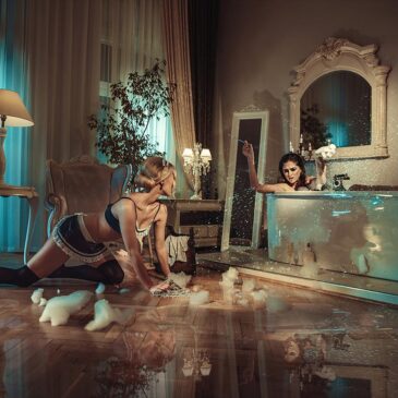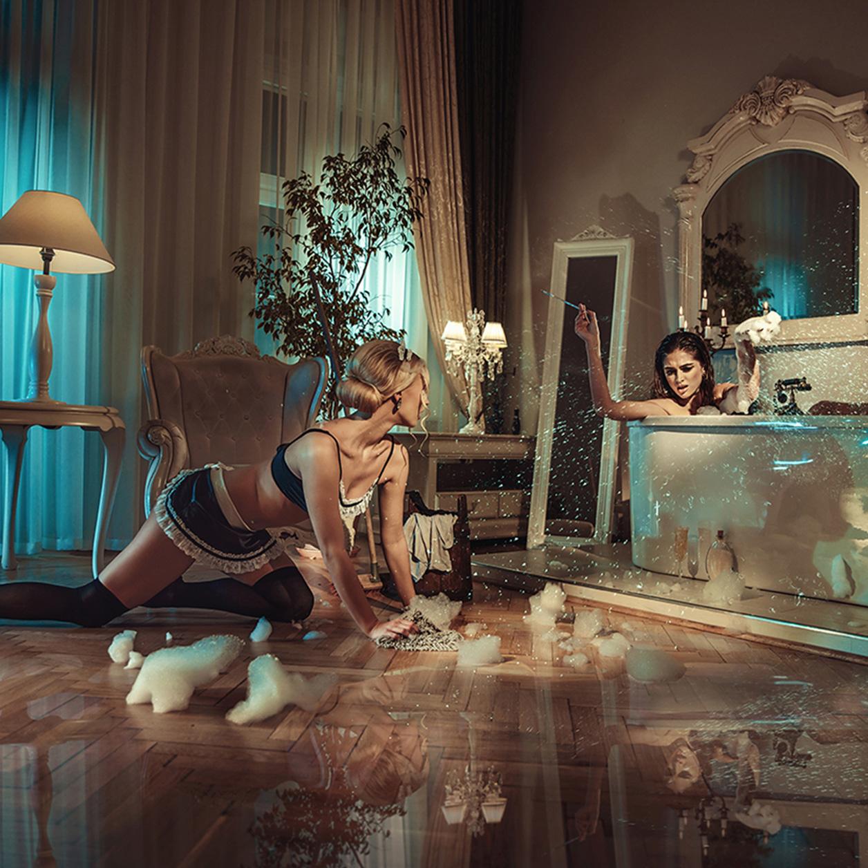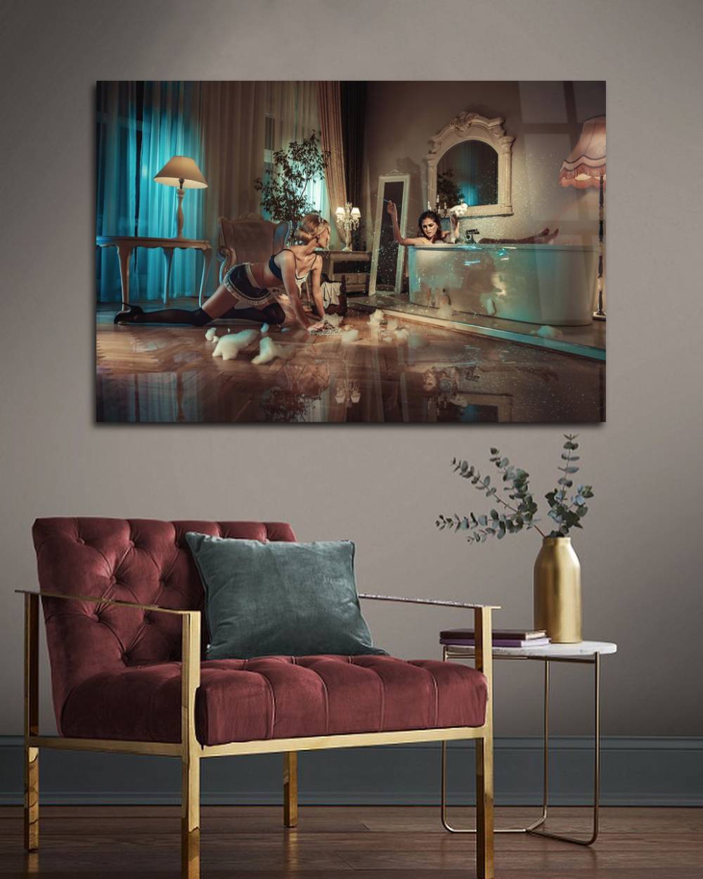 Drama Queens: Wall art van sexy women. Een drama queen trekt altijd alle aandacht naar zich toe en reageert vaak overdreven emotioneel op bepaalde gebeurtenissen of situaties. Het sexy plexiglas schilderij Drama queens is kunst fotografie van de bovenste plank. De vrouw in bad is de drama koningin die zich druk maakt over al het sop en water dat over de rand is gevloeid. Het sexy geklede dienstmeisje hoort haar aan en tracht op haar knieën de vloer weer droog te krijgen. De sensuele lading is voelbaar. Deze kunst fotografie van mooie erotische vrouwen maakt deel uit van de Drama Queen Collection, bestaande uit drie verschillende schilderijen: Drama Queens, Drama Queens II en Drama Queens IV: Drama Queens. Laat je verrassen door deze erotic, bijna naakt fotokunst aan de muur uit deze bijzondere en unieke collectie. Tevens verkrijgbaar op onder andere akoestisch vilt en Dibond