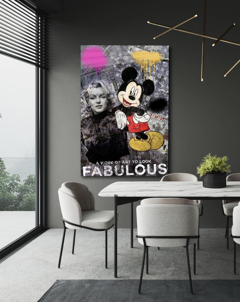 Celebrities wall art. Fotokunstwerk in pop art-stijl met Marilyn Monroe en Mickey Mouse in de hoofdrol. Deze Disney en Hollywood geïnspireerde Pop art-foto van Marilyn Monroe & Mickey Mouse is artistieke wall art en een stijlvolle aanvulling voor menig interieur. Verkrijgbaar op onder andere plexiglas, akoestisch vilt en Dibond. Bekijk ook de staande variant: Fabulous Art II