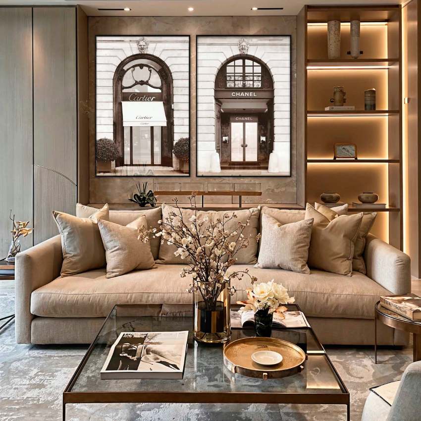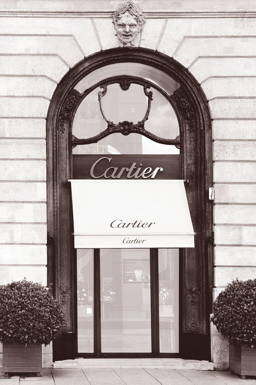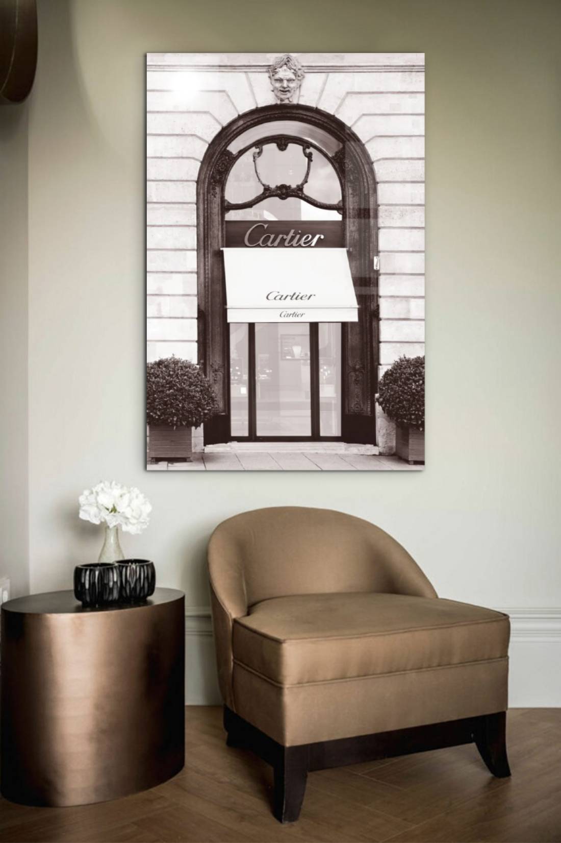 Foto van een luxe juwelierswinkel in Parijs. Een modern zwart wit fotokunstwerk die de verleiding van designer brands zoals Cartier verkent. Artistieke interpretatie van fashion art verkrijgbaar op onze verschillende materialen: acrylglas, Dibond en akoestisch doek. Bekijk naast deze foto van de luxe parfumwinkel ook de black & white fashion wall art van een bekende Parijse parfum winkel op onze website: Fashion Building I.