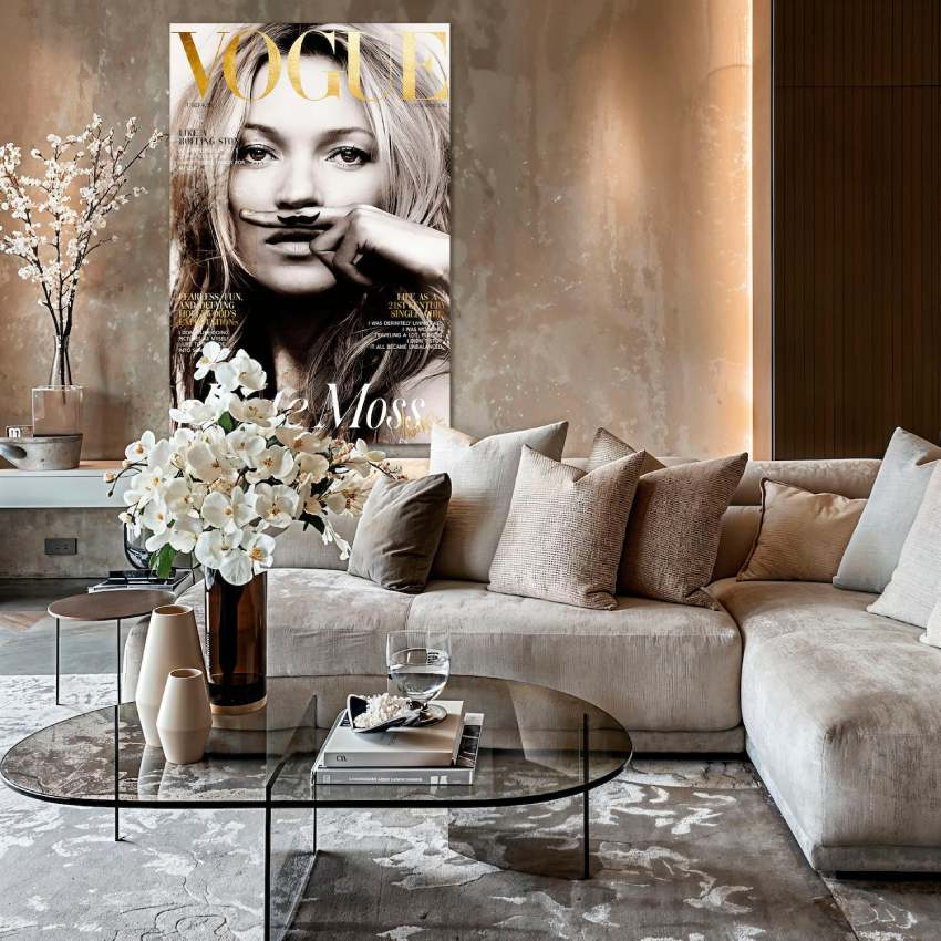 Modern fashion portret, kunst aan de muur geïnspireerd door Vogue stijl. Artwork van fashion cover met Kate Moss, verkrijgbaar op oa ons luxueuze acrylglas, Dibond of geluiddempende wall art voor een betere akoestiek. Deze celebrity fotokunst op de cover van het modeblad is een luxe mode schilderij ter aanvulling van een stijlvol interieur. Bekijk naast dit fashion magazine cover artwork ook andere mode artworks op onze website: Fashion.