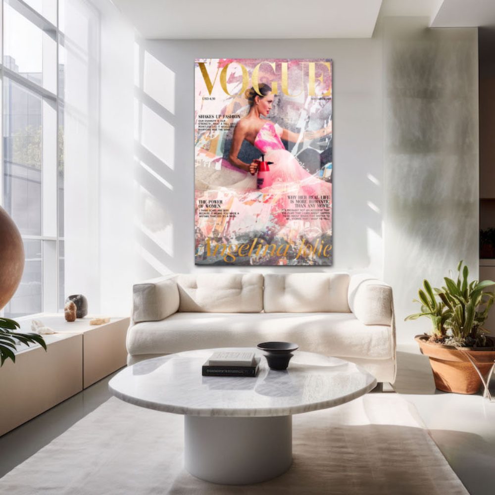 Vogue geïnspireerde wanddecoratie, exclusieve fashion art voor aan de muur. Fotokunst van Angelina Jolie op de cover van een modeblad. Dit schilderij van de fashion cover met Angelina Jolie is verkrijgbaar op verschillende materialen, zoals ons luxueuze acrylglas, Dibond of als akoestisch fashion artwork. Deze fotokunst van de celebrity op de cover van het bekende modeblad is een luxe modeschilderij en wordt met premium kwaliteit geprint op diverse materialen. Bekijk ook andere fashion artworks op onze website: Fashion
