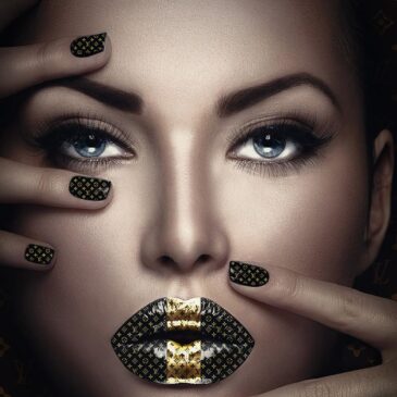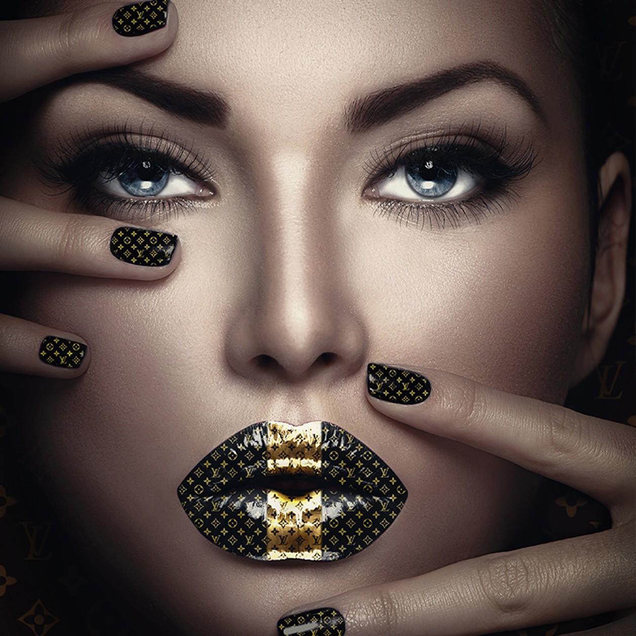 Wall art van sexy vrouw met gouden lippen. Een stijlvol portret met make-up als moderne kunst aan de muur. Geïnspireerd door de luxe esthetiek van Louis Vuitton, als artistieke interpretatie van mode en elegantie. Perfecte luxe wanddecoratie voor een interieur met klasse. Haar welgevormde wenkbrauwen en de donkere achtergrond maken de gouden lippen met fashion designer patroon expressief en interessant voor de aanschouwer. Verkrijgbaar op onder andere plexiglas, Dibond en akoestisch vilt. Bekijk ook Fashion Lips I op onze website: Fashion Lips I