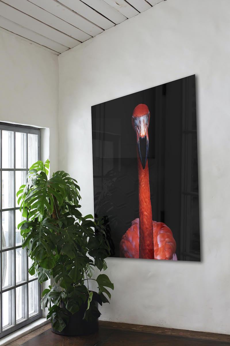 Dit leuke dierenportret van deze vogel, met bijzondere kleuren van diep roze, rood en groen, presenteert een trotse flamingo omringd door groene varens. Deze kunstzinnige dierenfoto komt fantastisch tot recht op onze verschillende materialen zoals acrylglas, akoestisch doek en Dibond. Bekijk naast deze vogelfotografie ook andere animal artworks op onze website: Animals