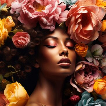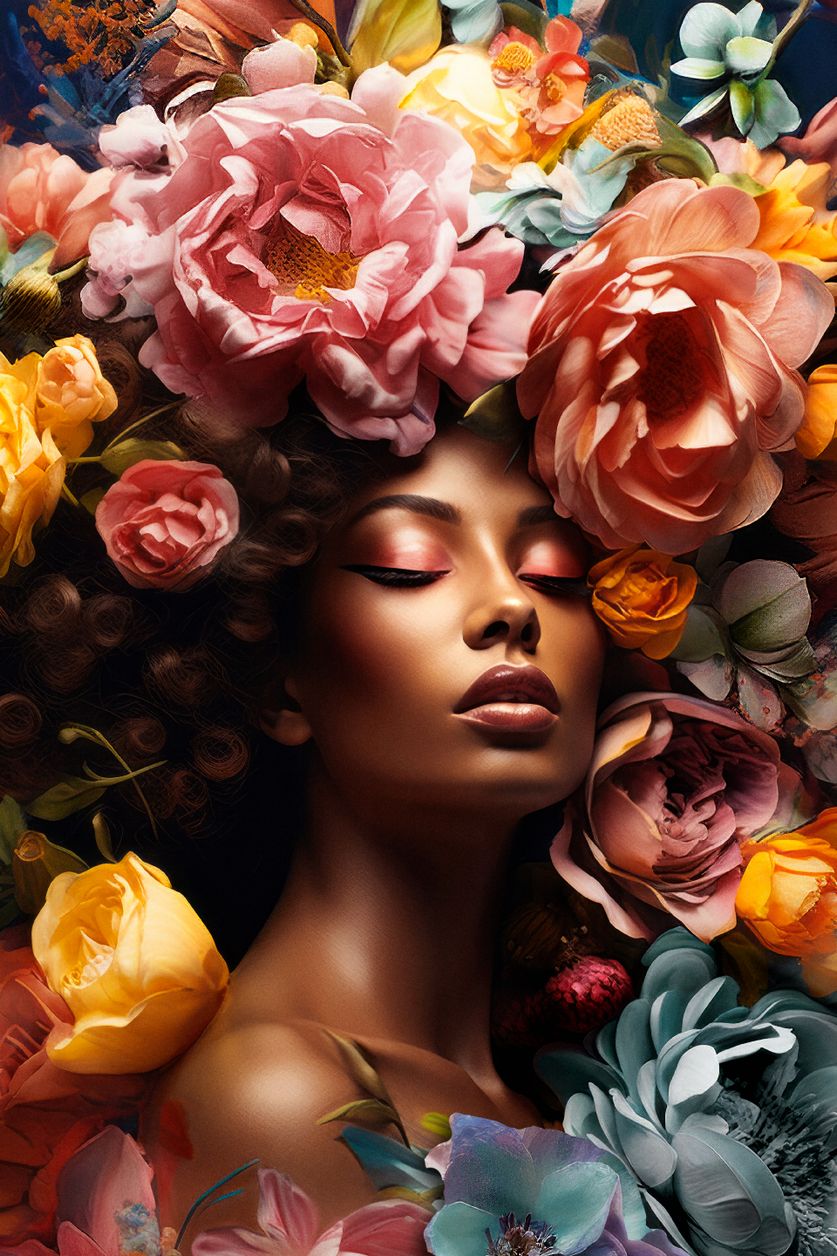 Vrouwenportret voor op de muur. Kleurrijk schilderij van een mooie vrouw met bloemen. Deze Flower Power Woman is een bijzondere artistieke foto van een prachtig vrouwenportret met kleurrijke bloemen om haar heen. Wanddecoratie van een mooie vrouw, die tot in de kleinste details op ons haarscherpe plexiglas van museumkwaliteit tot expressie komt, of bijvoorbeeld op ons duurzame akoestisch vilt voor een verbeterde akoestiek.
