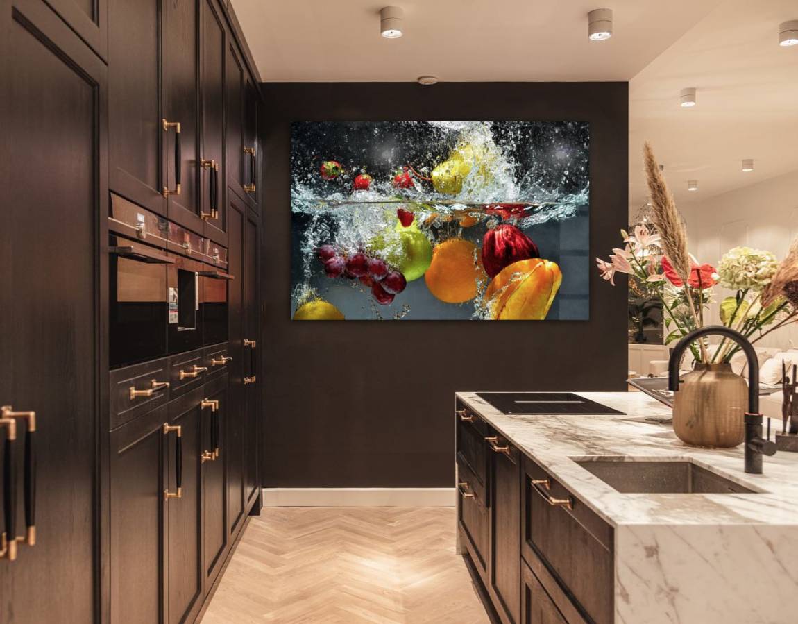 Luxueuze food art voor in de keuken van fruit dat in het water valt. De kleurrijke wanddecoratie met druiven, appels, peren, aardbeien, sinaasappels en tropisch fruit steekt prachtig af tegen de zwarte achtergrond. Deze chique keukendecoratie van fruit is verkrijgbaar op bijvoorbeeld ons luxueuze akoestisch vilt, Dibond of plexiglas van museumkwaliteit. Bekijk naast deze wall art van fruit ook de Chili Splash op onze website: Chili Splash