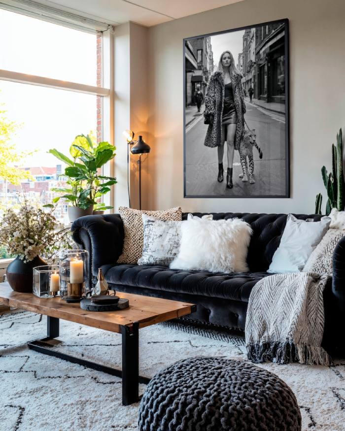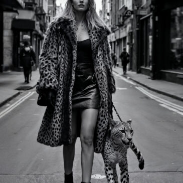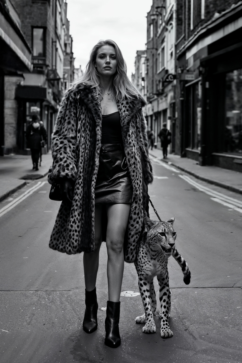 Wall art van een sexy vrouw met luipaard. Stoer zwart-wit fotokunstwerk van een badass woman. Luxe muurkunst van glamour lady. Verkrijgbaar als geluidsabsorberende wall art, Dibond-kunstwerk of als chique plexiglas schilderij.