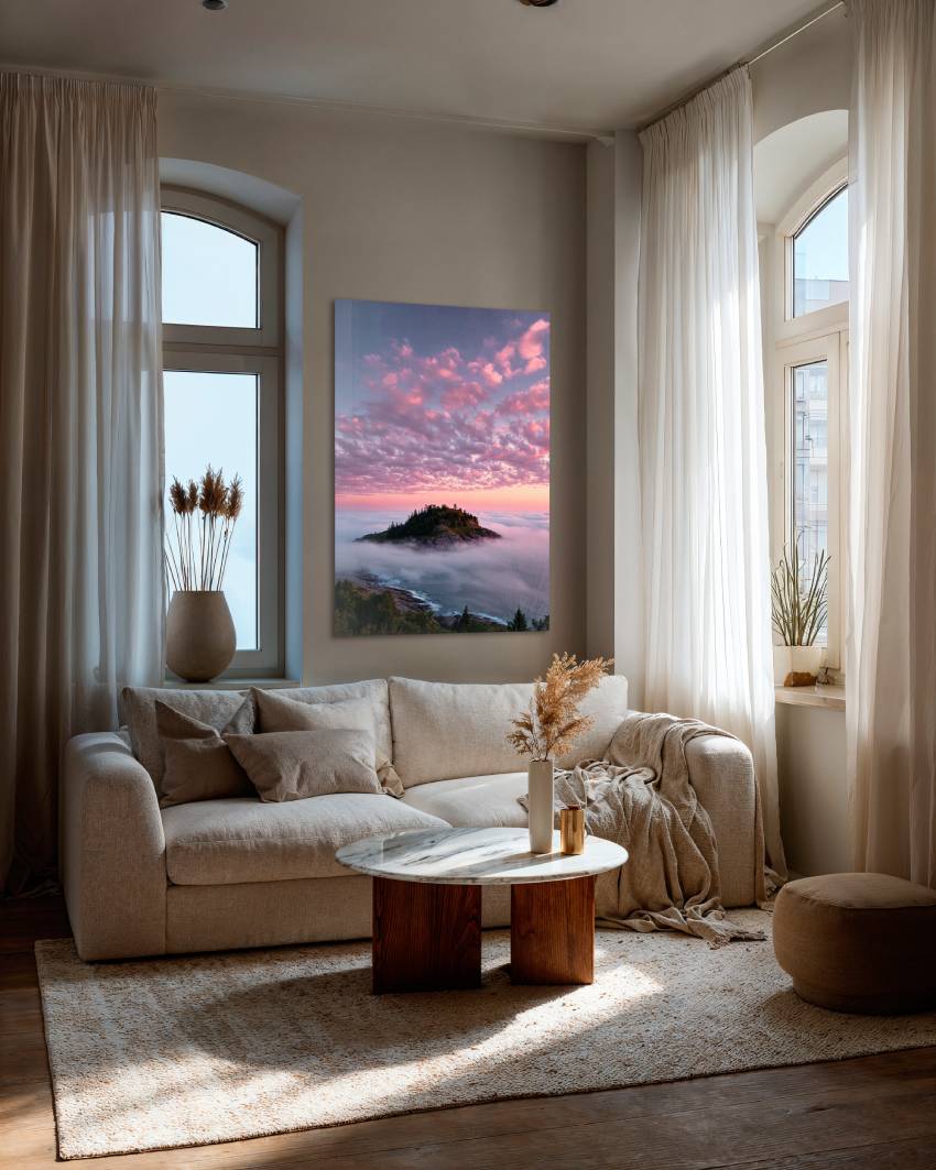 Akoestisch doek is een speciaal ontworpen materiaal dat geluid absorbeert en tegelijkertijd als stijlvolle wanddecoratie dient. Het combineert esthetiek met functionaliteit, waardoor het perfect is om zowel je interieur te verfraaien als de akoestiek in een ruimte te verbeteren tot wel 75%. Door de vilt textuur zijn de kleuren zachter dan bij plexiglas of dibond, wat vooral prachtig uitpakt bij abstracte en rustige werken. Met akoestische wanddecoratie verbeter je de geluidsbeleving in je huis of kantoor. Het doek dempt nagalm en storende geluiden, terwijl het kunstwerk een elegant statement maakt. Zo creëer je een rustige en harmonieuze sfeer met een chique geluiddempend schilderij.