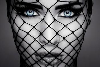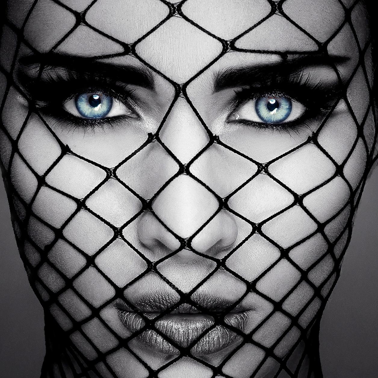 Sexy intensiteit in portret van mooie vrouw. De internationaal bekende fotografe Jennifer Remme is bijzonder goed in het vangen van uitdagende, spannende emoties. Dit portrait schilderij verbeeldt een vrouwelijk portret in spannende contrasten: de netkous geeft de impressie gevangen te zijn, maar de ogen zijn wild en dierlijk vrij. Het zwart-wit van het artwork wordt gecontrasteerd door de doordringende blauwe ogen. Deze woman raakt aan onze fantasie door haar sensualiteit, de netkous en intense blik. Een spannend, sensueel spel wordt in één blik gevangen. Verkrijgbaar op onder andere plexiglas, Dibond en akoestisch vilt. Bekijk naast dit portret van de mooie vrouw ook ander werk van Jennifer Remme: Jennifer Remme