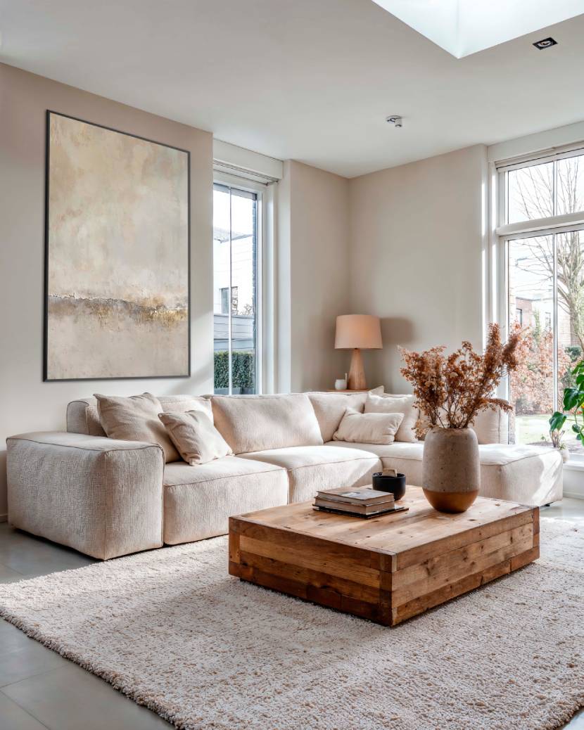 Abstracte Japandi wanddecoratie. Wall decor in Scandinavisch-Japanse stijl. Deze abstracte muurkunst in Japandi stijl in beige, crème, wit en gouden kleuren is verkrijgbaar als acrylglas schilderij, Dibond muurkunst of akoestisch fotokunstwerk. Bekijk onze gehele Japandi collectie: Japandi schilderijen