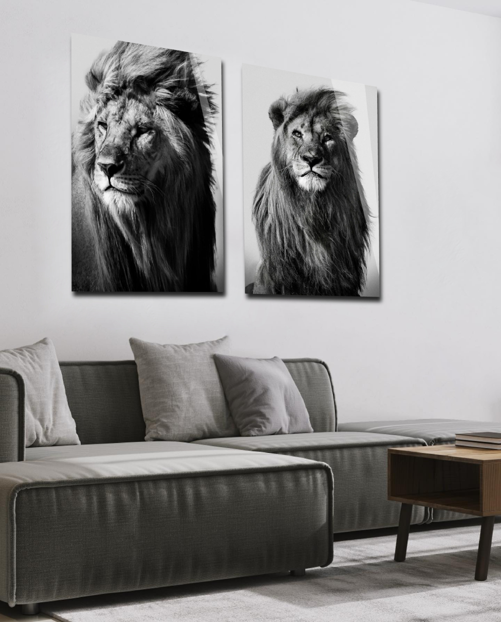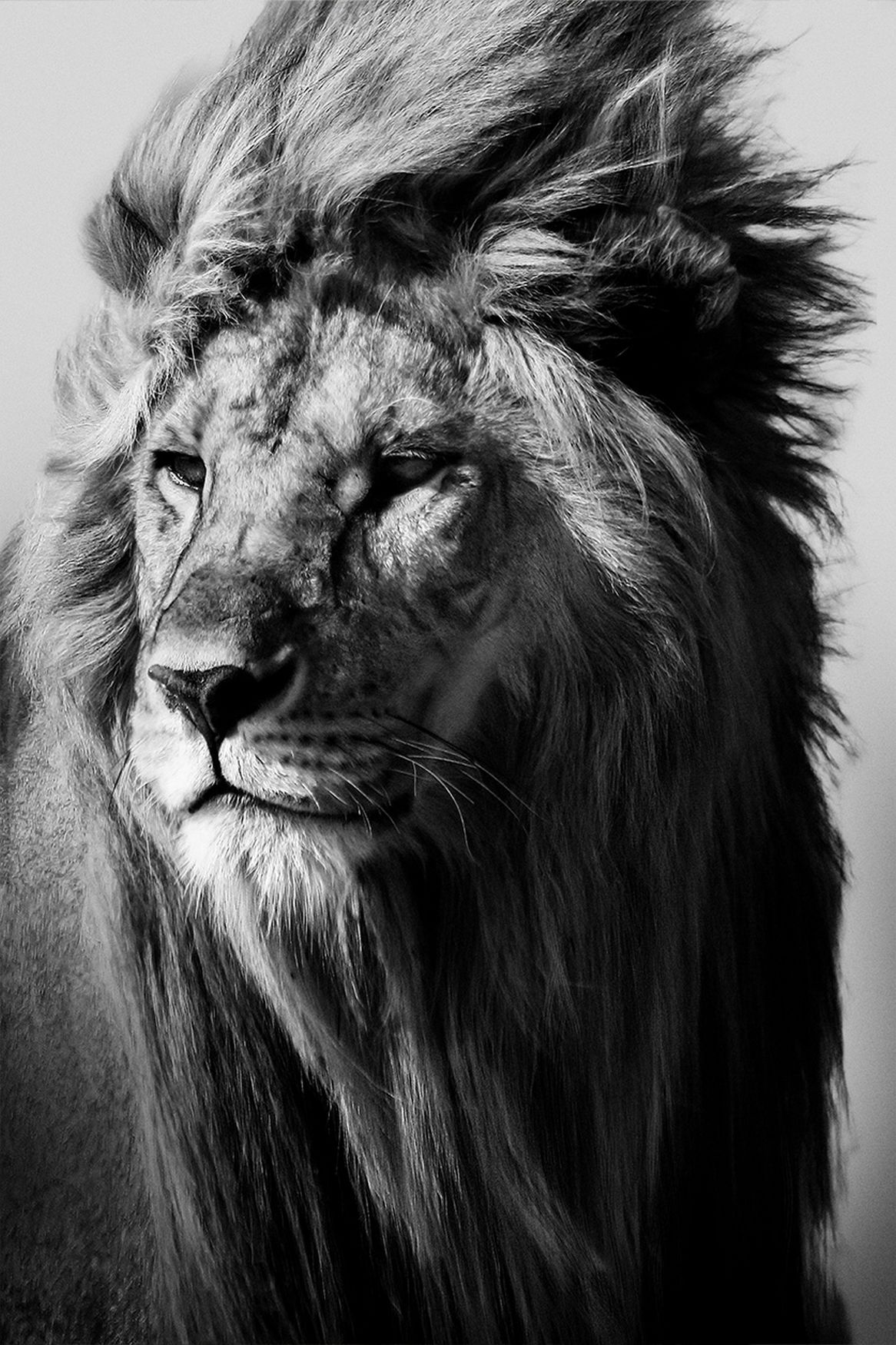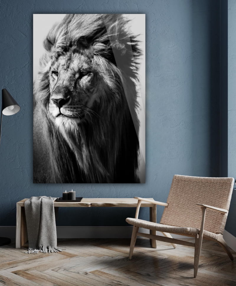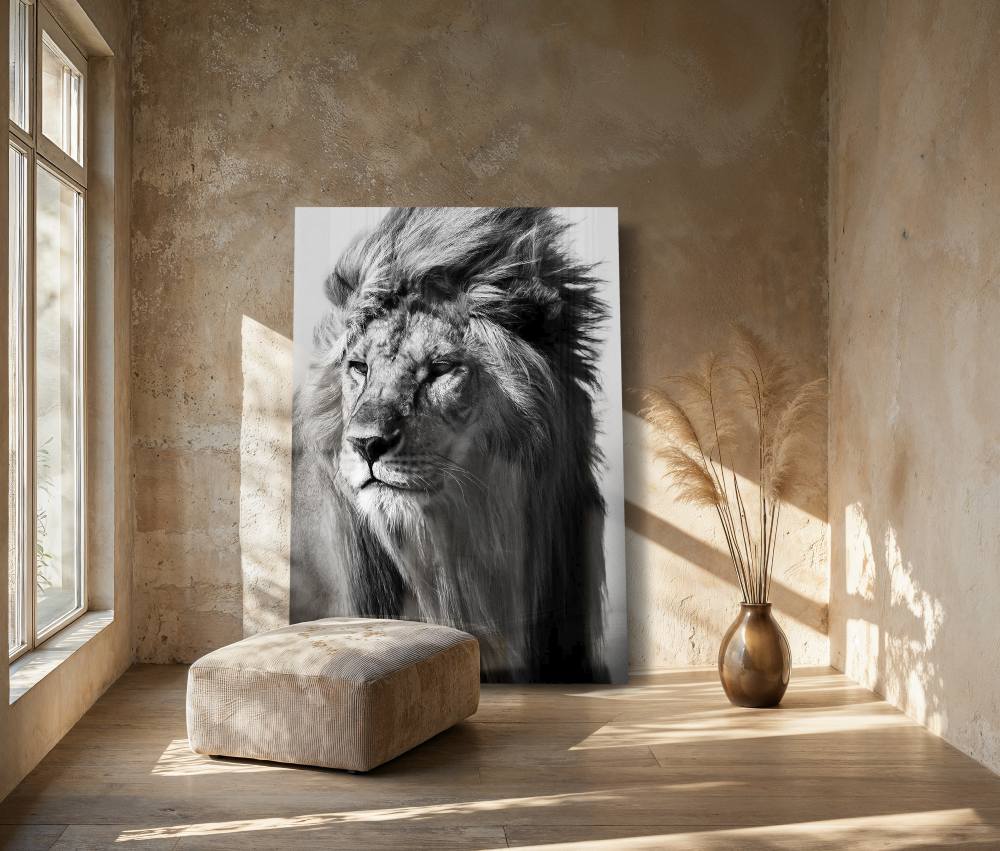 Zwart-wit foto van een leeuw in de wildernis. Een prachtig zwart-wit portret van een mannetjesleeuw. Dit leeuwen artwork presenteert een trotse mannetjesleeuw in zwart-wit fotografie. Dit indrukwekkende leeuwen artwork is verkrijgbaar als dierenkunstwerk op acrylglas, Dibond of akoestisch doek. Bekijk ook Lion in the Wild II op onze website: Lion in the Wild II.