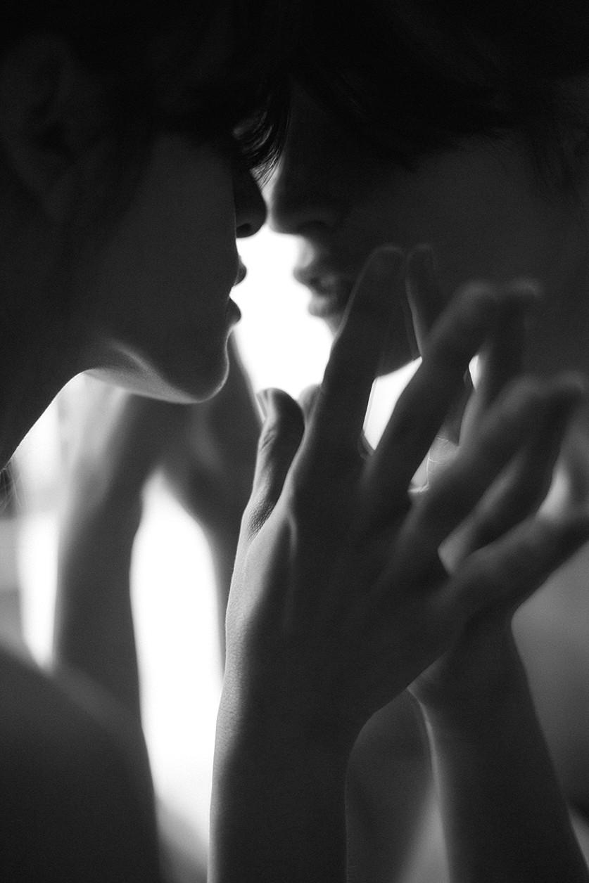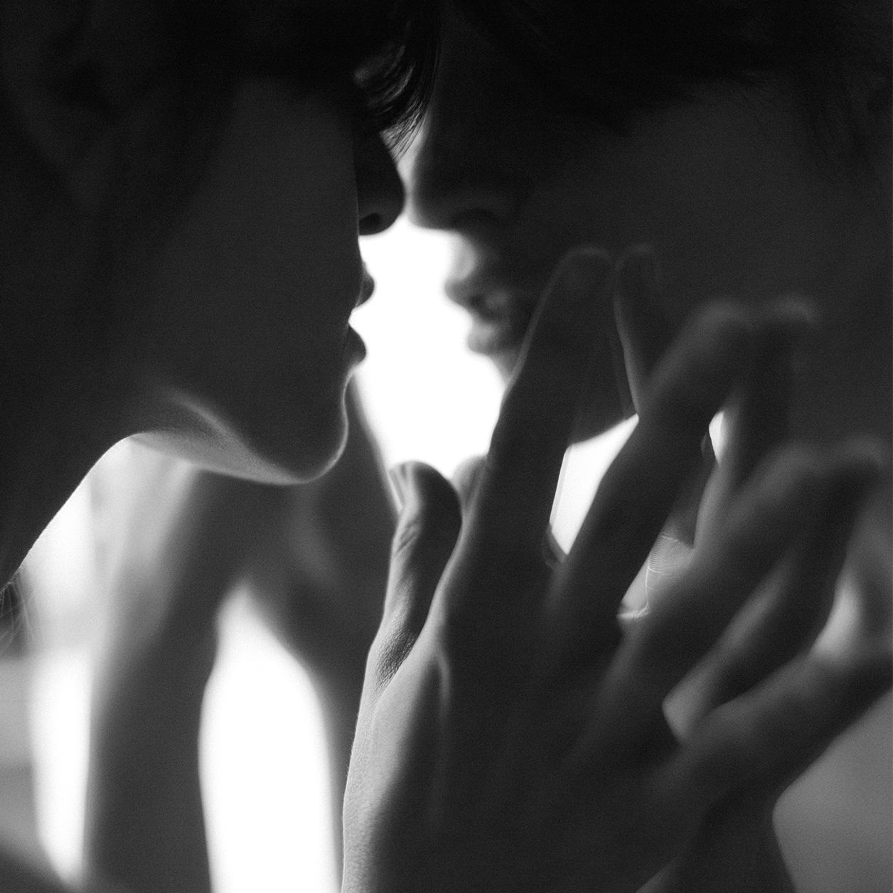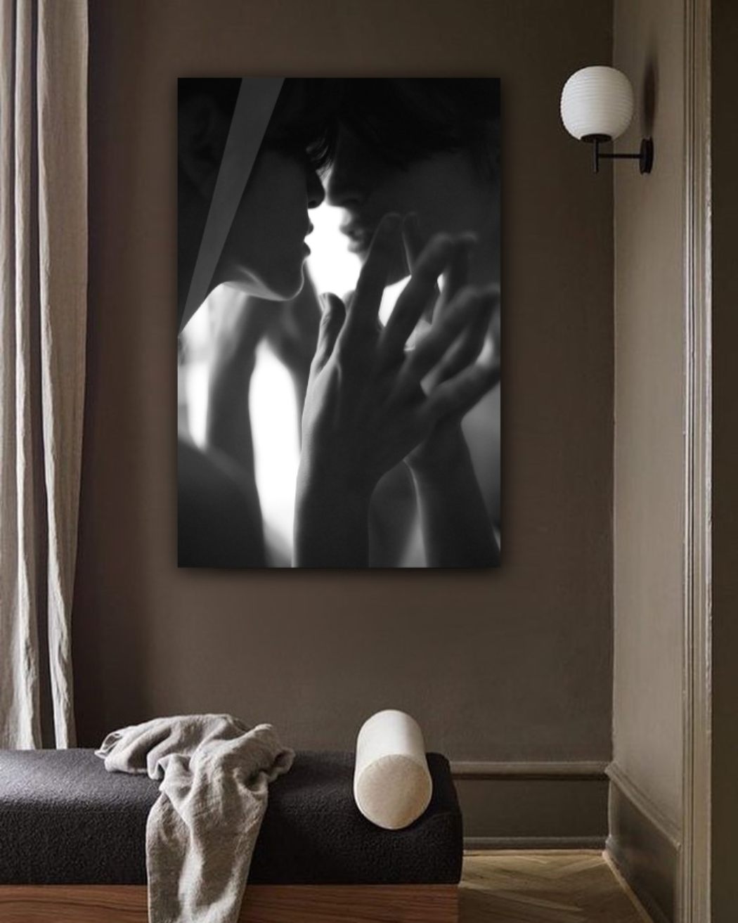 Black and white wanddecoratie van een mooie vrouw die in de spiegel kijkt en haar spiegelbeeld ziet. Deze dream woman is verkrijgbaar op onder andere andere plexiglas, Dibond of als geluidsabsorberende kunst. Bekijk ook andere black & white portrait wall art op onze website: Black & White Portrait