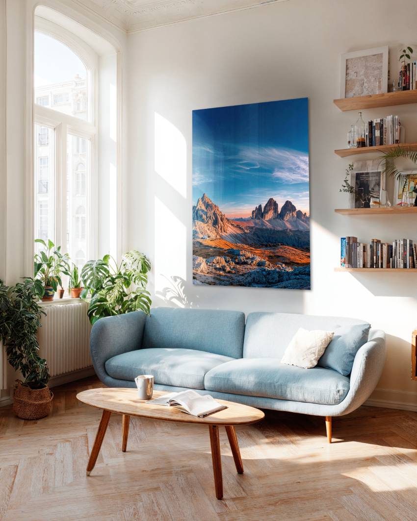 Wall art van een berglandschap in de Dolomieten, Italië. Wanddecoratie van ruige natuur met zonsopgang. Deze unieke kunst aan de muur van dit mooie natuurlandschap is verkrijgbaar als acrylglas schilderij, Dibond muurkunst of akoestisch fotokunstwerk.