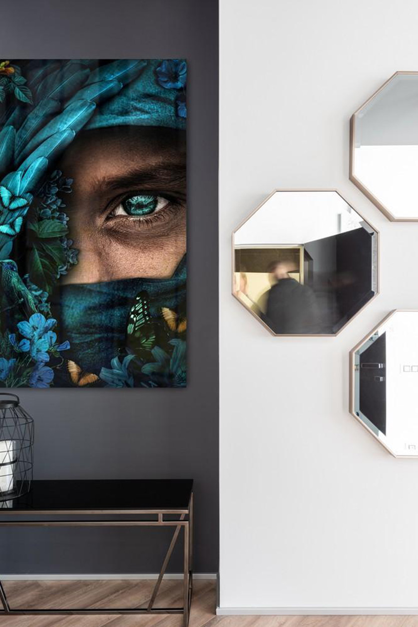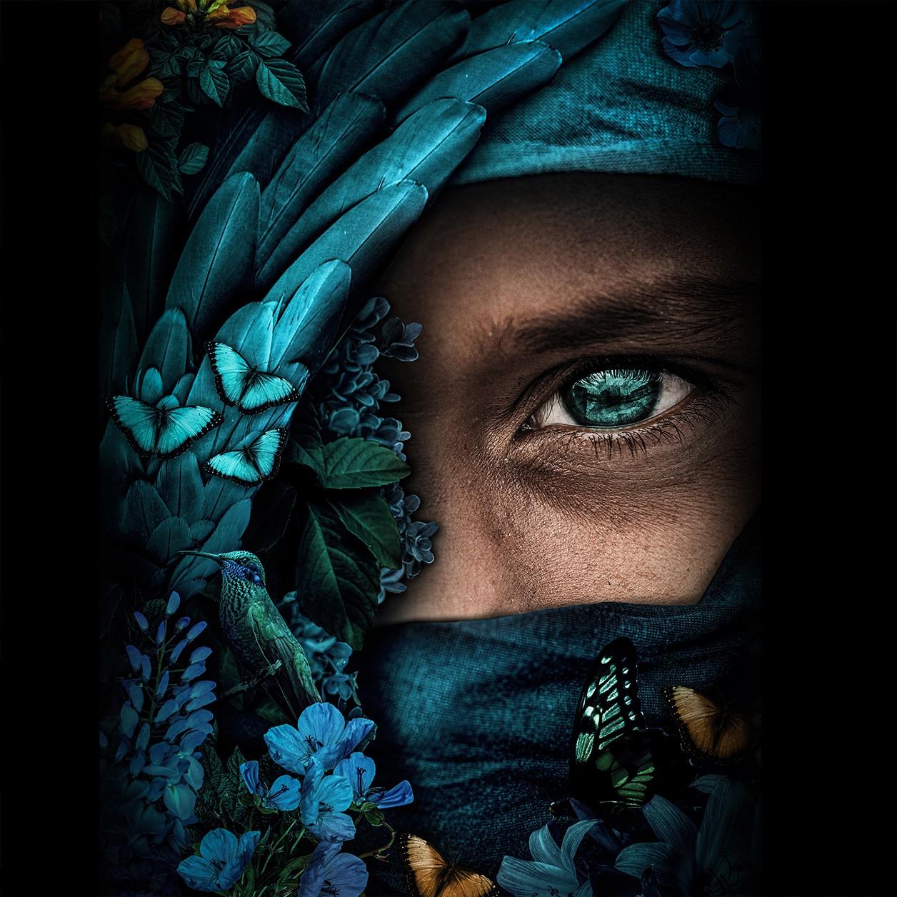 Portret foto van mysterieus gezicht. Portret kunst op akoestisch vilt, Dibond of plexiglas met lumineuze kleuren. Donkere kleuren en tinten van blauw en groen maken dit magische foto kunstwerk zeer geschikt voor elke ruimte in de woning. Dit portret schilderij is verkrijgbaar in staand, liggend en vierkant in verschillende formaten. Kijk ook eens bij de groene variant van dit portret: Mystery II