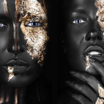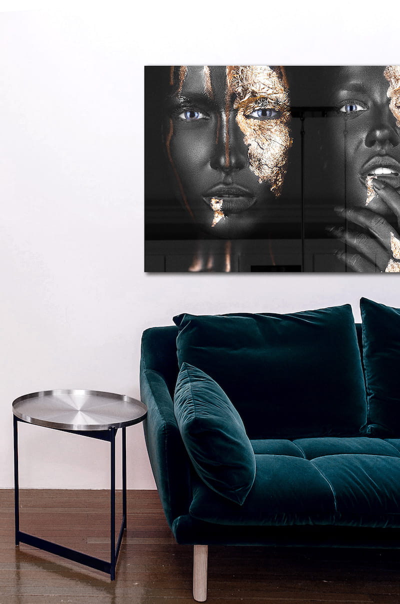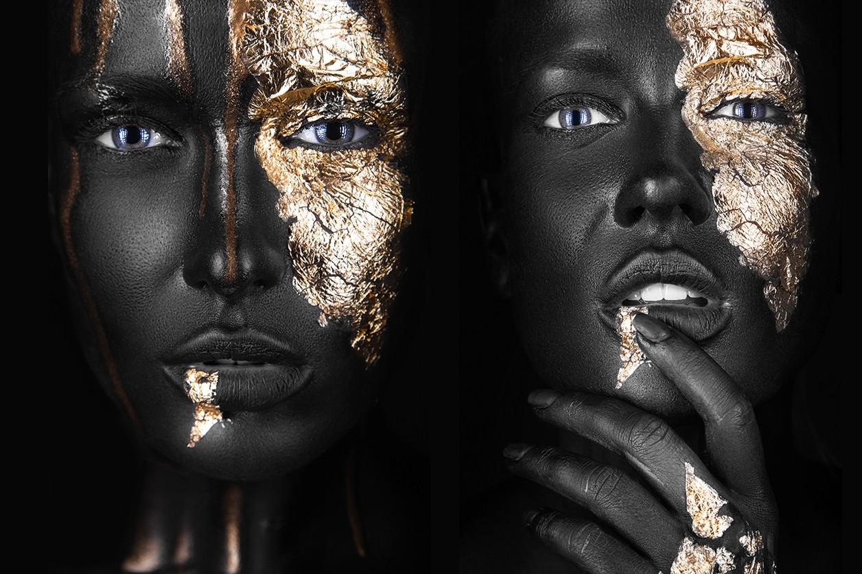 Artistiek portret schilderij Noir Gold & Noir Goldest. Een artistiek fotokunstwerk met zwarte gezichten, blauwe ogen en goud. Stijlvolle portrait wall art voor luxe kunst aan de muur van de populaire Noir Gold & Noir Goldest samen. Een ware bestseller! Verkrijgbaar op onder andere plexiglas, Dibond en akoestisch vilt. Bekijk de volledige Noir-serie: Noir portret collectie