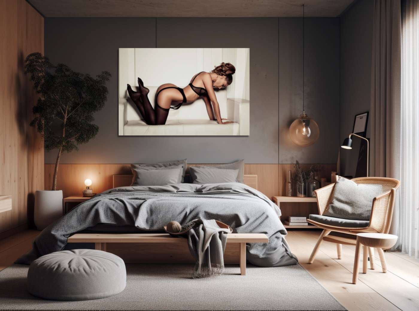 Mooie, uitdagende foto van een vrouw die een sensueel spel speelt. Dit speelse naakt schilderij, ideaal voor de slaapkamer, is verkrijgbaar op onder andere plexiglas, Dibond of geluidsabsorberend doek. Bekijk ook onze andere sexy nude schilderijen: