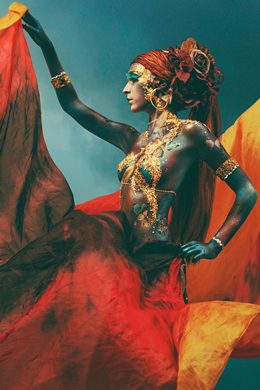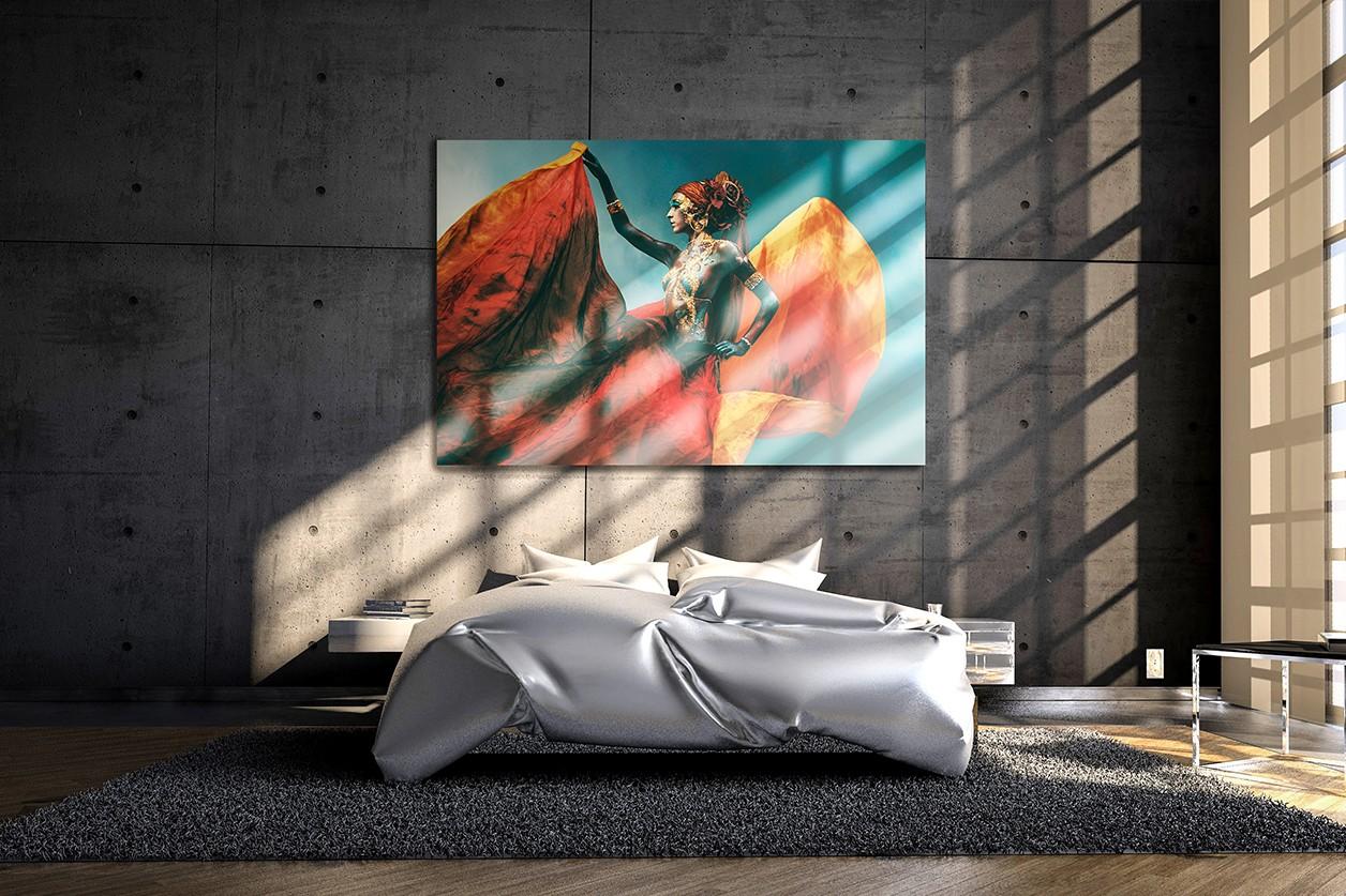 Artistic, kleurrijk foto-artwork van een fantasy woman. Fantasie kunstwerk van een bohemian vrouw in een oranje jurk. Muurdecoratie van een mooie fantasie-vrouw gecreëerd door de uiterst creatieve fotograaf Jaime Ibarra. Deze wanddecoratie is verkrijgbaar op verschillende materialen zoals acrylglas, Dibond en akoestisch doek. Bekijk ook andere unieke kunstwerken van Jaime Ibarra: