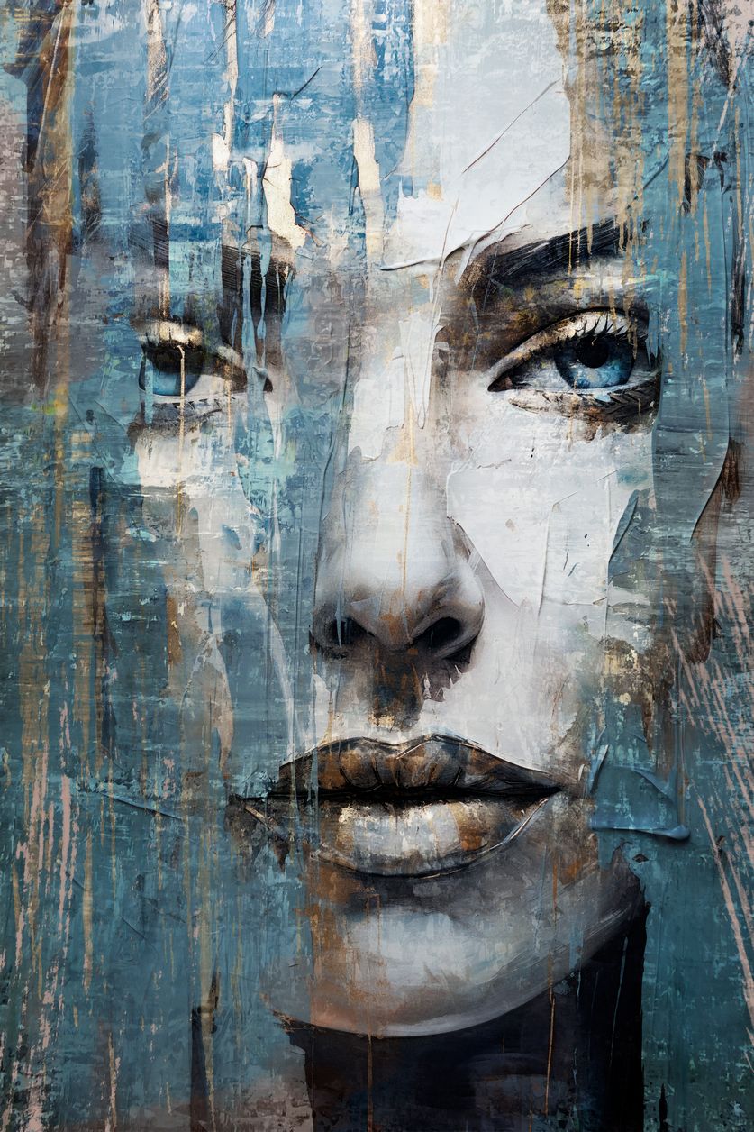 Artistiek geschilderd portret van een mooie vrouw. Dit unieke portret toont ons het geschilderde gezicht van een mooie vrouw. Deze vrouwen fotokunst voor op de muur is onderdeel uit een serie van drie portret kunstwerken en dus zeer geschikt voor een mooie tweeluik of drieluik van acrylglas, Dibond of akoestisch doek.