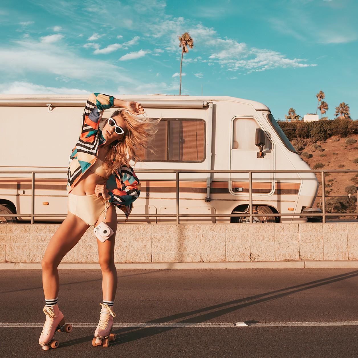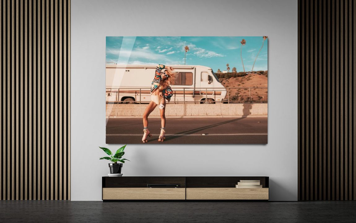 Artistieke muurdecoratie van hippy vrouw met retro lifestyle. Dit speelse unieke werk voor aan de muur, maakt een sprong naar het recente verleden met zijn retro lifestyle uitbeelding. De camper, de hippie kleding, haar zonnebril en de camera om de nek van de vrouw nemen ons mee terug naar de jaren ’60 en ’70. Deze sprong in de tijd heeft de fotograaf weten te versterken door de faded colours die deze heeft gekozen. Het geeft een dromerig effect…alsof de aanschouwer in een soort roes naar het verleden meegenomen wordt. Dit artistieke artwork op plexiglas van deze hippy woman doet ons denken aan de hippies en het landschap van Californië, in de Verenigde Staten, waar de hippies in die tijd veelal naartoe trokken. Verkrijgbaar op onder andere plexiglas, Dibond en akoestisch vilt.