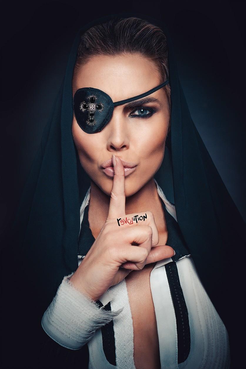 De fotograaf Brendan DeClerq creëerde hier een rebelse muurkunst van een mooie vrouw die een sexy revolutie tegen de Catholieke kerk pleegt!. De zwart witte kleding, het kruisje op haar piraten ooglapje, de make-up die uitdagend lager in de ooghoek is doorgewerkt, de honende sensuele vinger voor de lippen, het open shirtje… het zijn allemaal symbolen van revolutie en losbreken van de oude religieuze normen en waarden. Een sexy revolutie tegen de Katholieke kerk. Het plexiglas schilderij van deze mooie woman van Declerq drijft subtiel de spot met de oude religieuze wetten… Al met al een krachtig en esthetisch revolutionair statement voor uw interieur. Verkrijgbaar op onder andere plexiglas, Dibond en akoestisch vilt. Bekijk meer werk van Brendan DeClerq op onze website: Brendan Declerq Photography