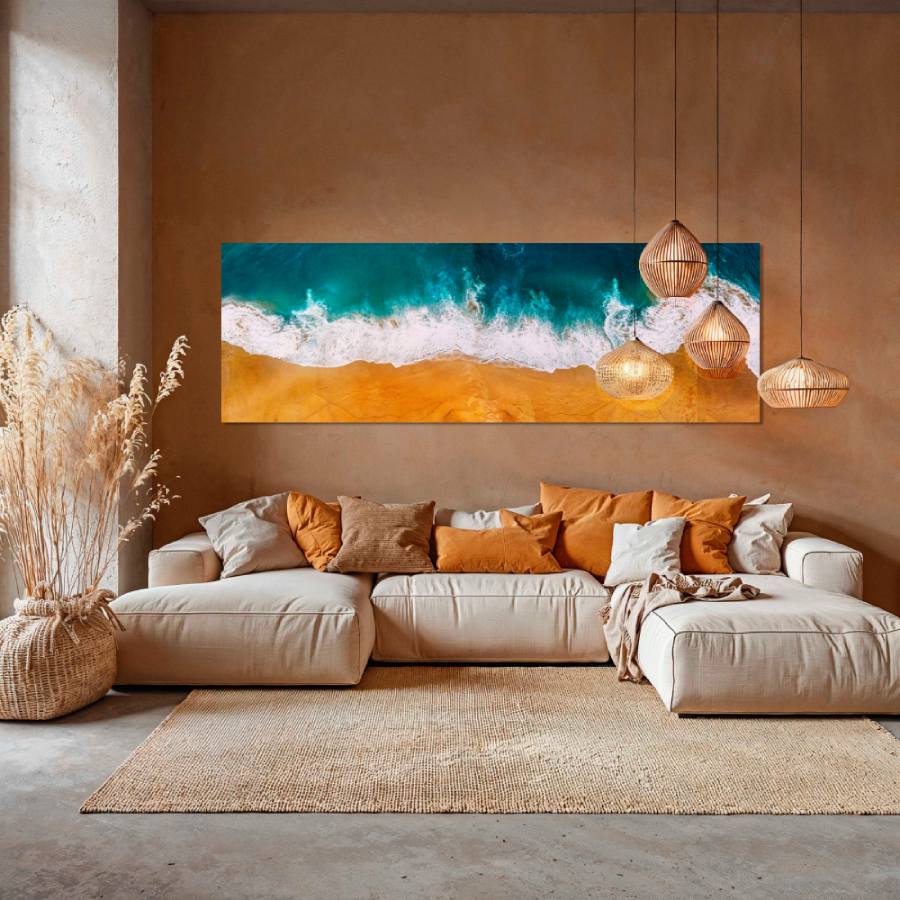 Lumineuze strandfoto van een geel strand, golven en de zee. Een bijna abstract artwork van de zee, verkrijgbaar op verschillende materialen zoals acrylglas, Dibond en akoestisch doek. Neem naast deze strand wall art een kijkje bij onze gehele landschappen collectie: