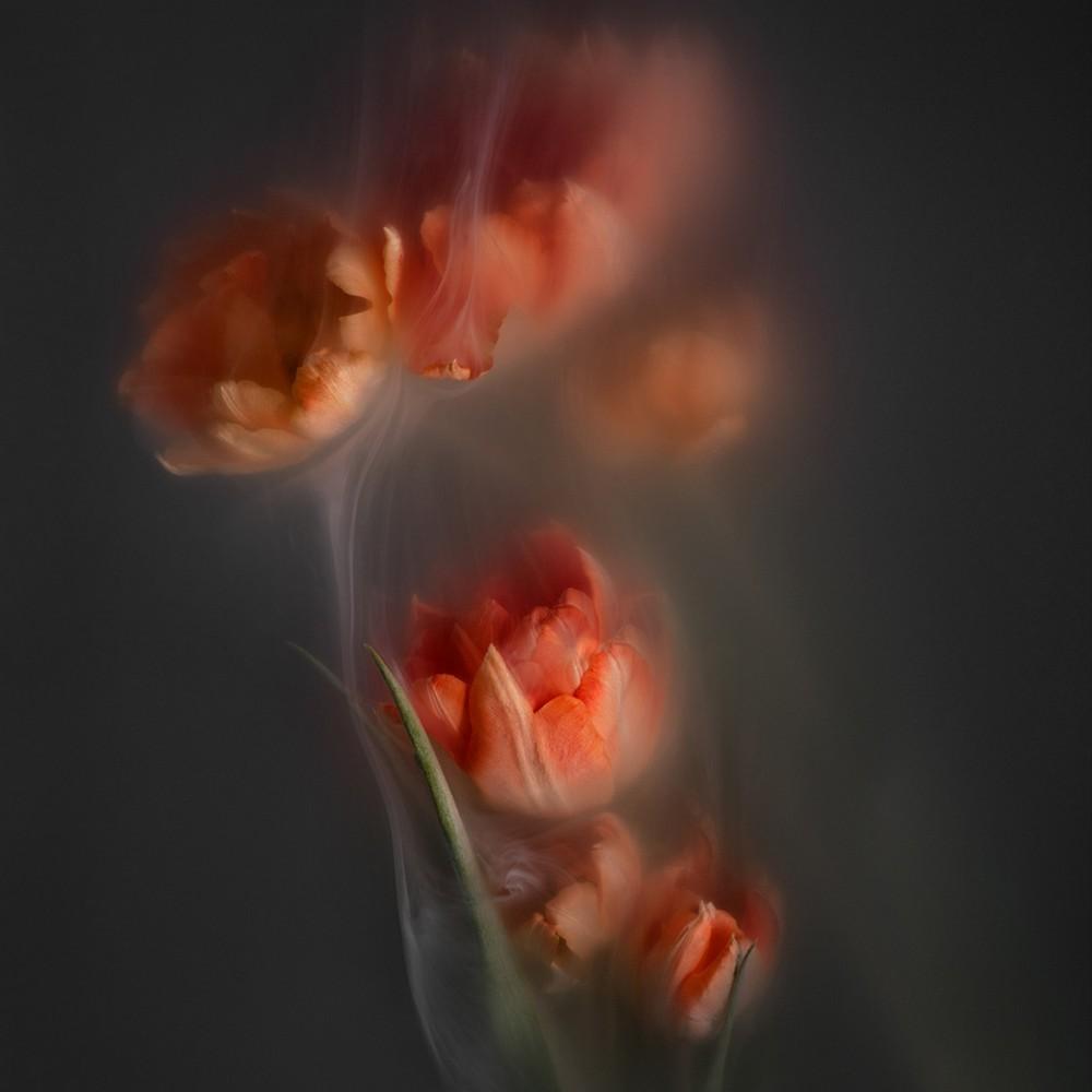Laat u meenemen in het melancholisch surrealisme van dit flower fotokunstwerk op glas van Robert Peek. Deze fotograaf haalt met dit bloemen stilleven inspiratie uit de thema’s ‘eenzaamheid’ en ‘afgescheidenheid’, wat krachtig wordt verhaald door zijn diep donkere kleurenpalet en zijn spannend bewerkte stillevens van bloemen in rook. Unieke muurkunst van een bloemen stilleven met oranje flowers in surrealistische vertaling welke een chique expressie aan elk interieur geeft. Verkrijgbaar op onder andere plexiglas, Dibond en akoestisch vilt. Bekijk naast deze abstracte bloem fotokunst de gehele serie van Robert Peek Smoking Flowers en ander werk in onze collectie: Robert Peek Photography
