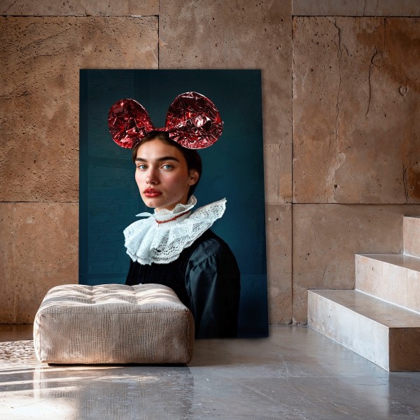 Artistieke interpretatie van het Disney karakter Mickey Mouse. Speels modern portret als oude meester. De fotograaf heeft een speelse draai gegeven aan de werken van de oude meesters met dit bijzondere artistieke schilderij. De houding van de mooie vrouw op het doek en de grote kraag verwijzen naar klassieke kunstportretten op deze art foto. Maar dit moderne luxe fotokunstwerk wordt als moderne kunst geaccentueerd met de Mickey Mouse-oren op haar hoofd. Verkrijgbaar als onder andere akoestische muurdecoratie acrylglas schilderij en Dibond artwork Neem een kijkje bij onze gehele portret collectie Portraits