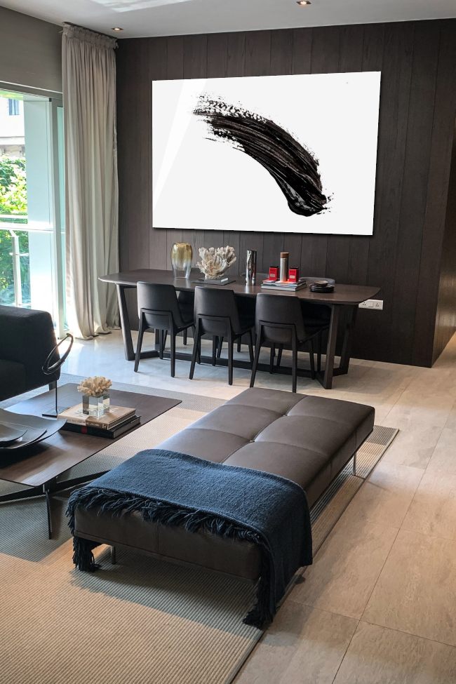 Abstracte zwart-wit fotokunst van een verfstreep, geïnspireerd door de Japanse schilderkunst. Creatieve wall art, beïnvloed door de Japanese brushstrokes. Deze abstracte black & white schilderkunst is onder andere verkrijgbaar op plexiglas, Dibond en akoestisch doek. Bekijk ook onze andere abstracte fotokunst in Japanse stijl: Japanese Wall Art