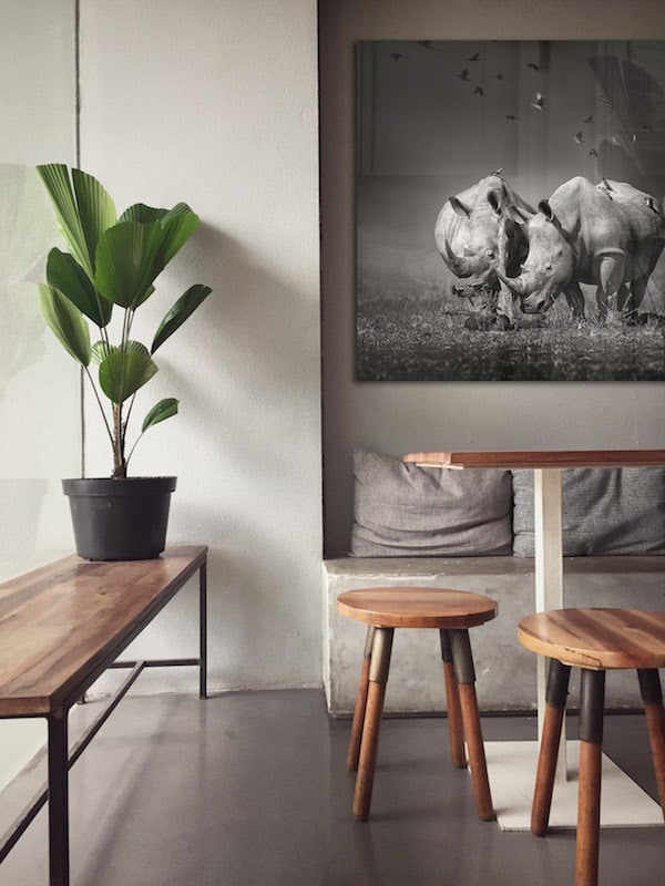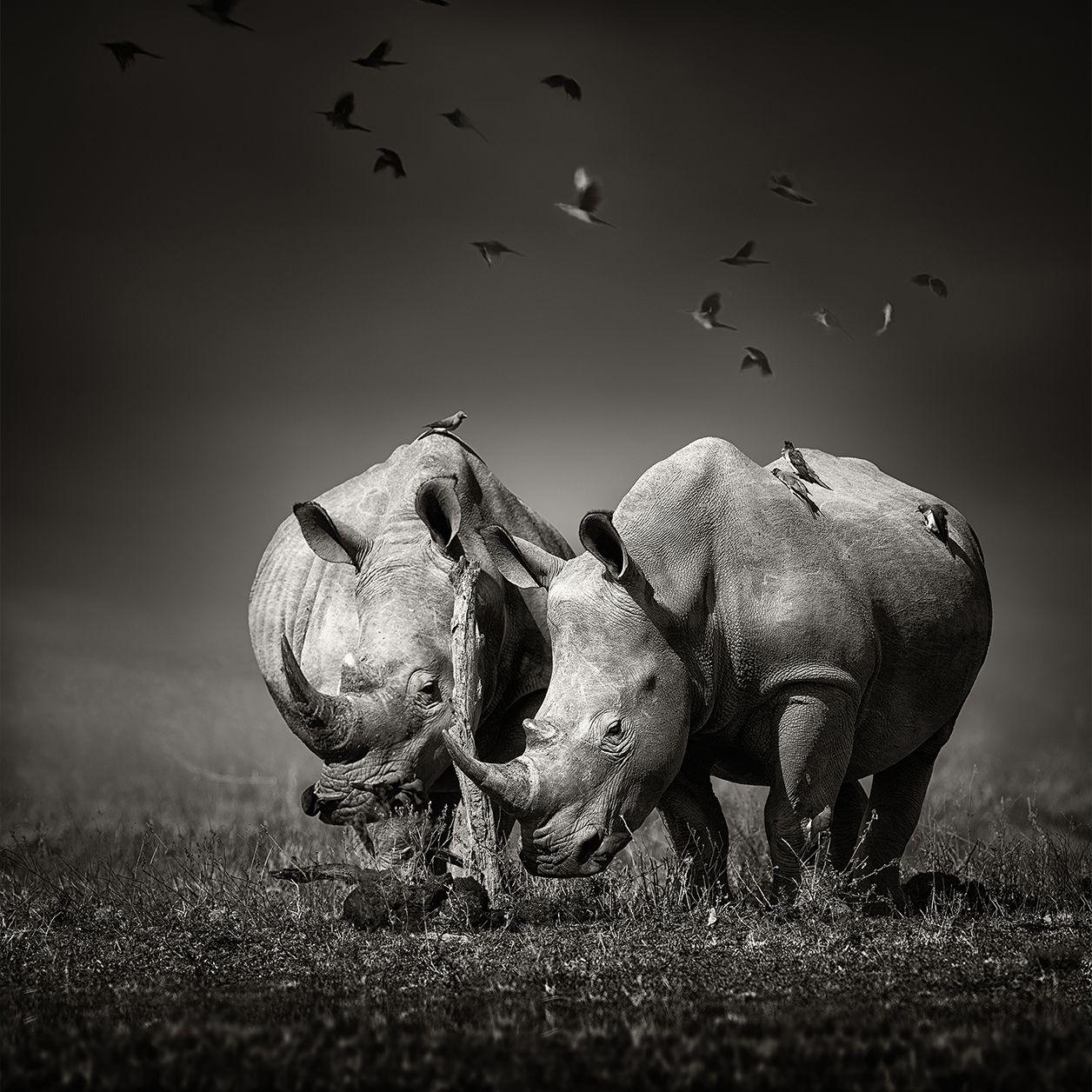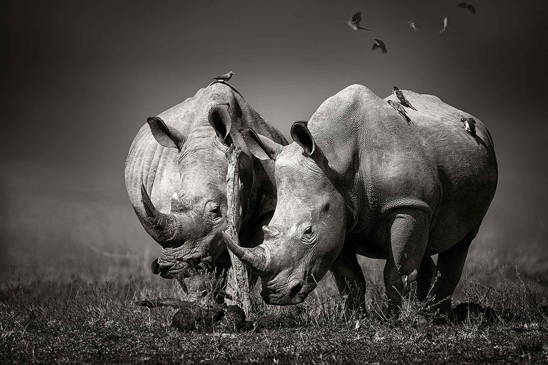 Wildlife fotokunst voor aan de muur met Afrikaanse wilde dieren. Zwart-wit foto van twee neushoorns op de Afrikaanse savanne, met vogeltjes op hun rug. Muurkunst van een neushoorn-paar op black & white fotoart. Dit zwart-wit schilderij met wilde dieren is verkrijgbaar als plexiglas schilderij, geluidsabsorberende muurkunst of Dibond fotokunst. Bekijk de volledige African Wildlife Collection op onze website: