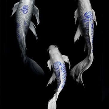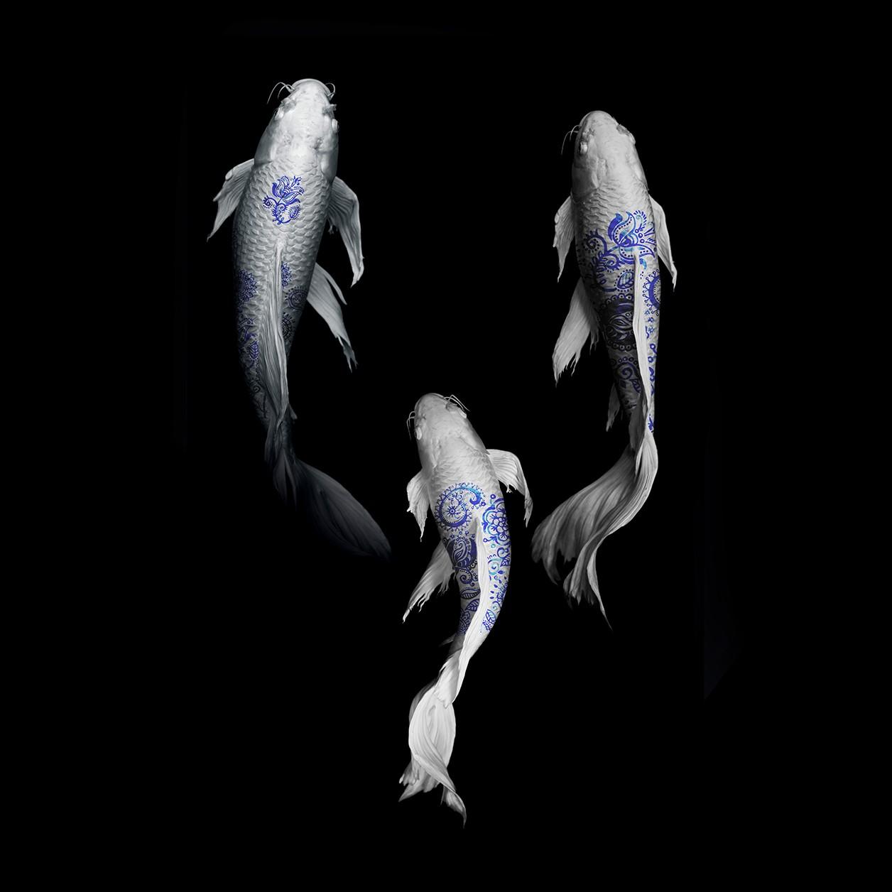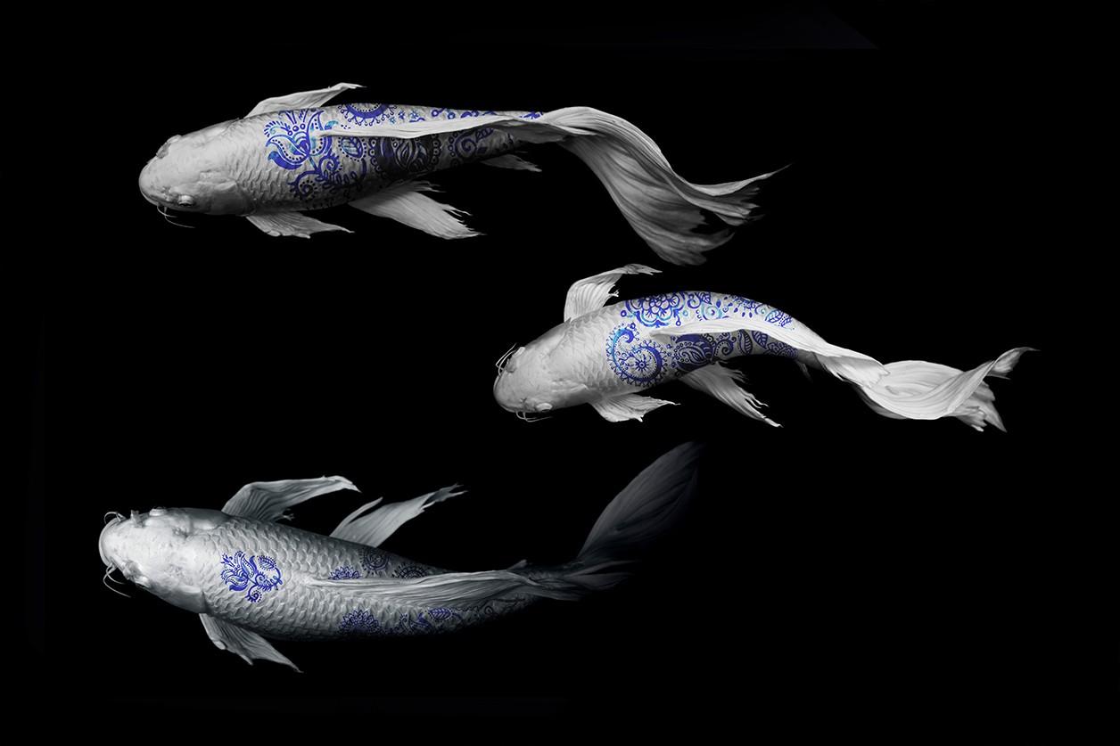 Deze wall art van witte vissen heeft een unieke touch met hun blauwe bloem-tekeningen op hun rug, die doen denken aan Delfts Blauwe motieven. Een interessante en creatieve dierenfoto, verkrijgbaar als schilderij op plexiglas, Dibond en akoestisch doek. Bekijk naast deze vissenfotografie ook andere vis artworks op onze website: