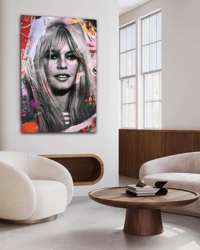 Fotokunst van Brigitte Bardot: beauty en hedonist. Een cultuur icoon pur sang uit de 50’s en de 60’s wordt hier geportretteerd op speelse en sensuele wijze op artistic fotokunst. Deze sexy wall art van Brigitte Bardot geeft met de kleurrijke wilde pop-art bewerking een passende uitdrukking aan het rijke leven van deze extravagante celebrity. Haar moderne sexy appearance en wilde onaangepaste levensstijl was een inspiratie voor velen en maakte haar voor de vrouwenemancipatie tot een voorbeeld en tevens een sex symbool. Brigitte bezat beiden! Brigitte Bardot, ook wel B.B genoemd, drukte haar levenskunst uit als actrice, danseres en zangeres. Maar tevens als publieke figuur was ze een excentriek en vernieuwend voorbeeld voor haar tijd. Moderne kunst, verkrijgbaar op onder andere plexiglas, Dibond en akoestisch vilt. Bekijk ook de Bardot I op onze website:The Bardot I