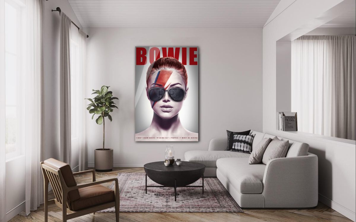 Een door deze celebrity geïnspireerd fotokunstwerk van de beroemde eigenzinnige zanger David Bowie. Stijlvolle wall art van dit beroemde icoon toont ons een geschilderd vrouwengezicht in de stijl van Bowie. Artistiek artwork van een zeer geliefde celeb, verkrijgbaar op onze verschillende materialen zoals acrylglas, Dibond en akoestisch doek. Bekijk ook andere celebrity art op onze website: