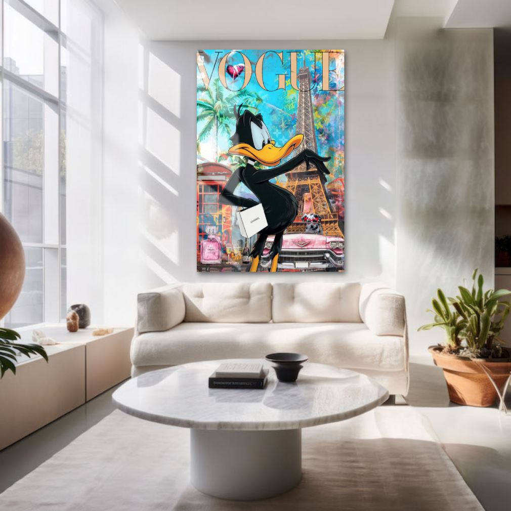 Schilderij van fashion cover met Daffy Duck. Fotokunst van Daffy Duck op de voorpagina van een fashion magazine. Een vrolijk mode artwork geprint op ons luxueuze acrylglas, Dibond of bijvoorbeeld op ons duurzame akoestisch vilt voor een verbeterde akoestiek. Kleurrijke artistieke pop art interpretatie van Warner Bros Daffy Duck, Rolls Royce en de Eiffeltoren op de cover van het modeblad Vogue, perfect voor de aanvulling van jouw interieur! Bekijk ook andere fashion artworks op onze website: Fashion