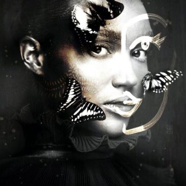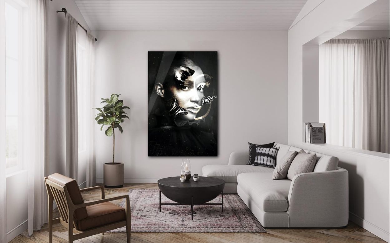 Een mooie vrouw met vlinders siert deze wanddecoratie op bijzondere wijze. Ze heeft hier en daar een vlinder op haar gezicht in dit stijlvolle vrouwenportret. Deze artistieke black and white fotoart van de woman with butterflies is onder andere verkrijgbaar op plexiglas en akoestisch doek. Bekijk ook andere unieke wall art van deze fotografe: