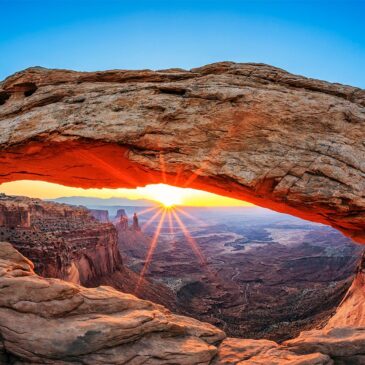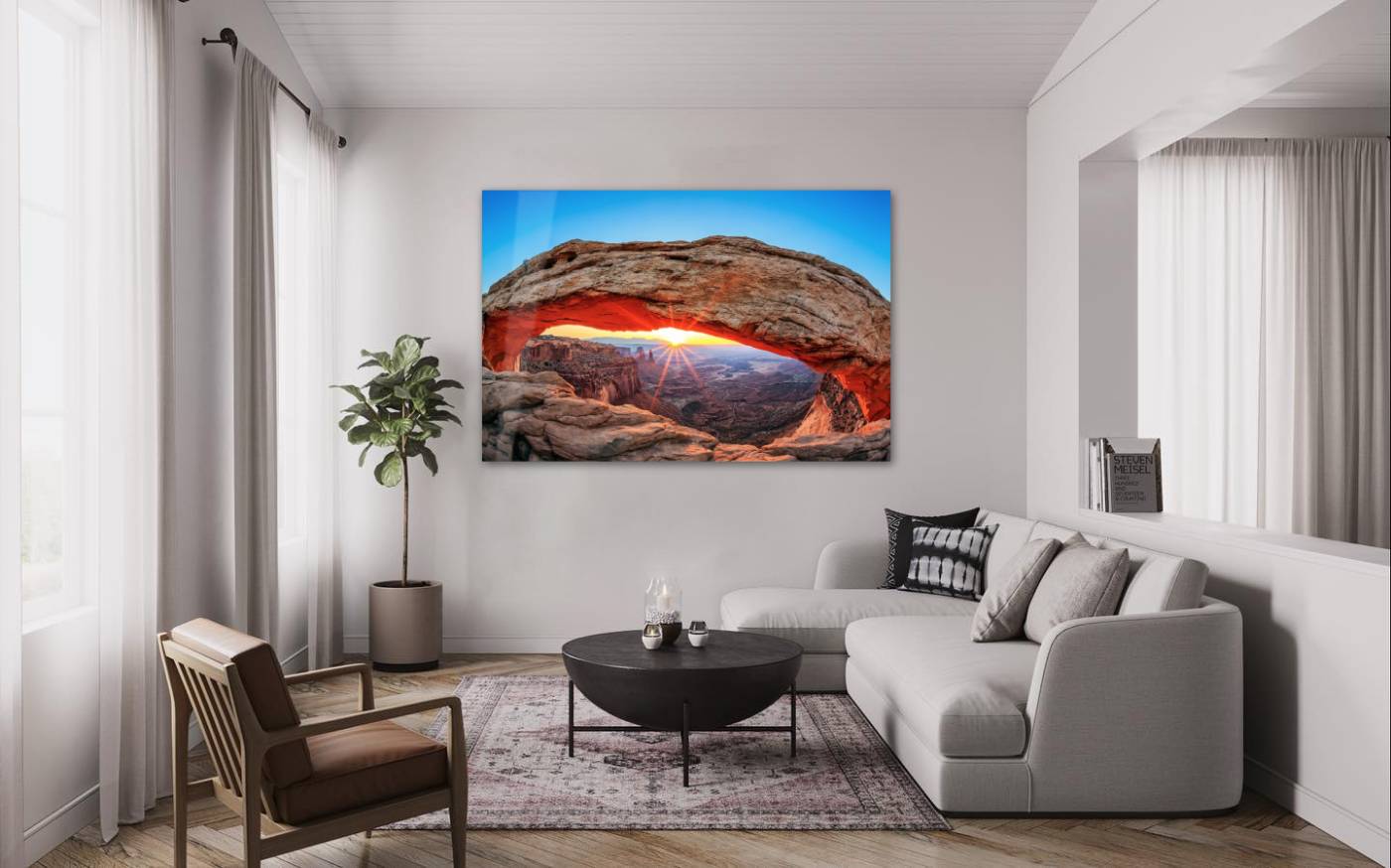 Werk aan de muur van Mesa Arch in Utah. Sommige plekken moet je gezien hebben, maar het is niet iedereen gegeven om alle natuurwonderen van de wereld te bezoeken. Met het plexiglas schilderij The Mesa Arch Utah in de Verenigde Staten haal je een van de unieke locaties op deze planeet in huis. De Mesa Arch is een indrukwekkende boog van natuursteen met kuilen in het Canyon-lands National Park in de Amerikaanse staat Utah. Het foto kunstwerk toont de boog op het mooiste moment van de dag: in de ochtend als de zon door de boog schijnt. De op het rotsgebergte weerkaatsende zonnestralen zorgen voor een prachtig schouwspel. Bezoekers hebben na een wandeling een spectaculair uitzicht op de canyons. Verkrijgbaar op onder andere plexiglas, Dibond en akoestisch vilt.