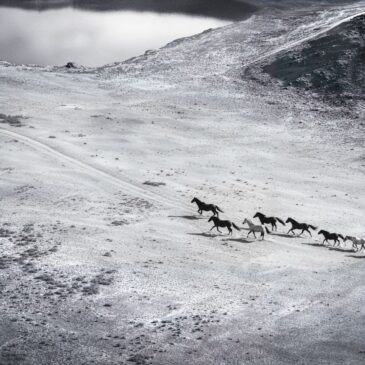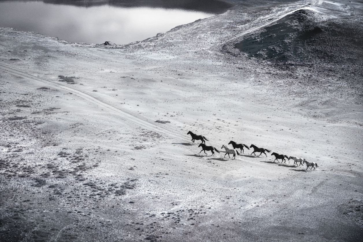 Zwart wit fotokunst van wilde paarden op een prairie. Wanddecoratie van een leeg landschap in black & white. Minimalistische natuurkunst: wilde paarden galopperen door een sereen, grijs landschap met een meer op de achtergrond. Dit schilderij van ruige natuur is verkrijgbaar als muurdecoratie op akoestisch vilt, Dibond art of plexiglas wanddecoratie.